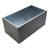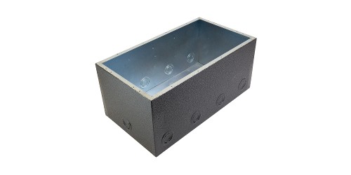 Rough in boxes are heavy duty welded 14 gauge steel and mate exclusively with all Double Wide Stage Pockets to support conduit connection and protect the stage pocket under the floor surface. Always in stock for onsite delivery, back boxes arrive complete with a temporary protective cover that is discarded when the pocket is installed. Wet back boxes are ASTM electrodeposited with clear zinc for corrosion protection before an additional jacket of polyurethane is applied to provide moisture resistance to the box.