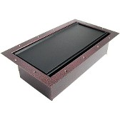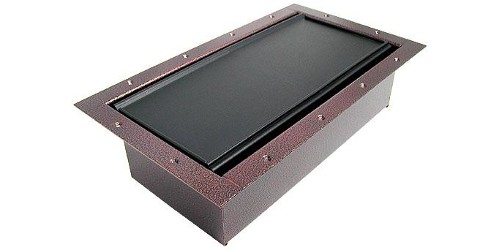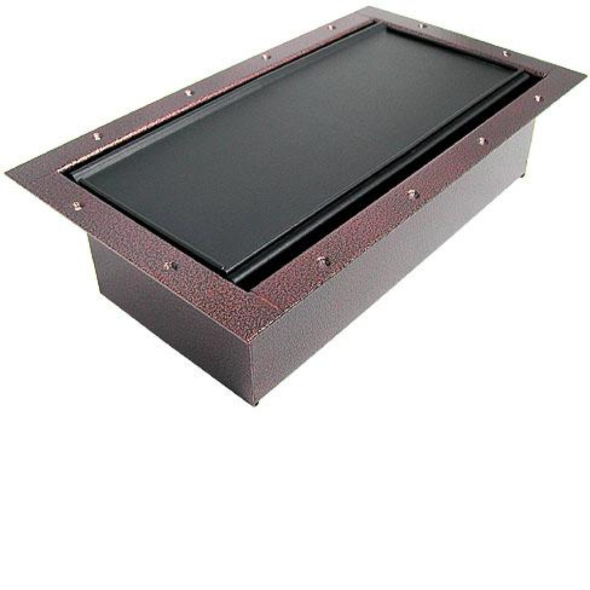 The Double Wide Stage Pocket is double the size of the standard Full Pocket and is made of heavy duty steel to conceal and protect high voltage and low voltage connections in this one dual application floor box. The slant panel configuration protects connectivity from damage and dust by placing connections upright, below the floor surface and under the recessed carpet lid. This lid option sits below the pocket flange so when flooring is glued inside the rimmed lid edge, the covered black lid, coppervein pocket flange, and surrounding floor are visually flush. The Double Wide Pocket is designed so terminated panels can be installed before or after pocket installation to support multi-phase construction applications.