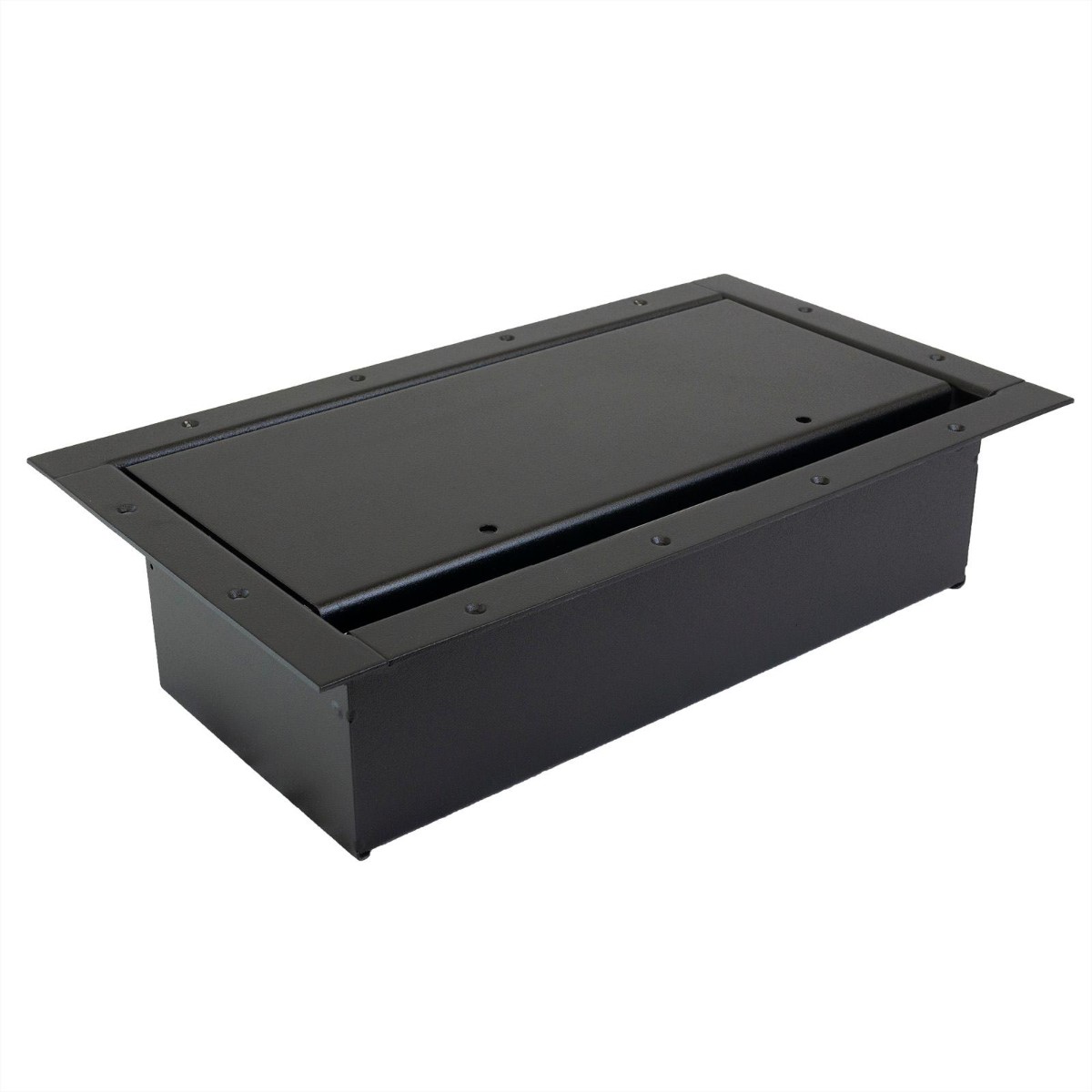 The Double Wide Stage Pocket is double the size of the standard Full Pocket and is made of heavy duty steel to conceal and protect high voltage and low voltage connections in this one dual application floor box. The slant panel configuration protects connectivity from damage and dust by placing connections upright, below the floor surface and under the modified lid configuration allowing more cable exit room. The Double Wide Pocket is designed so terminated panels can be installed during any phase of construction.