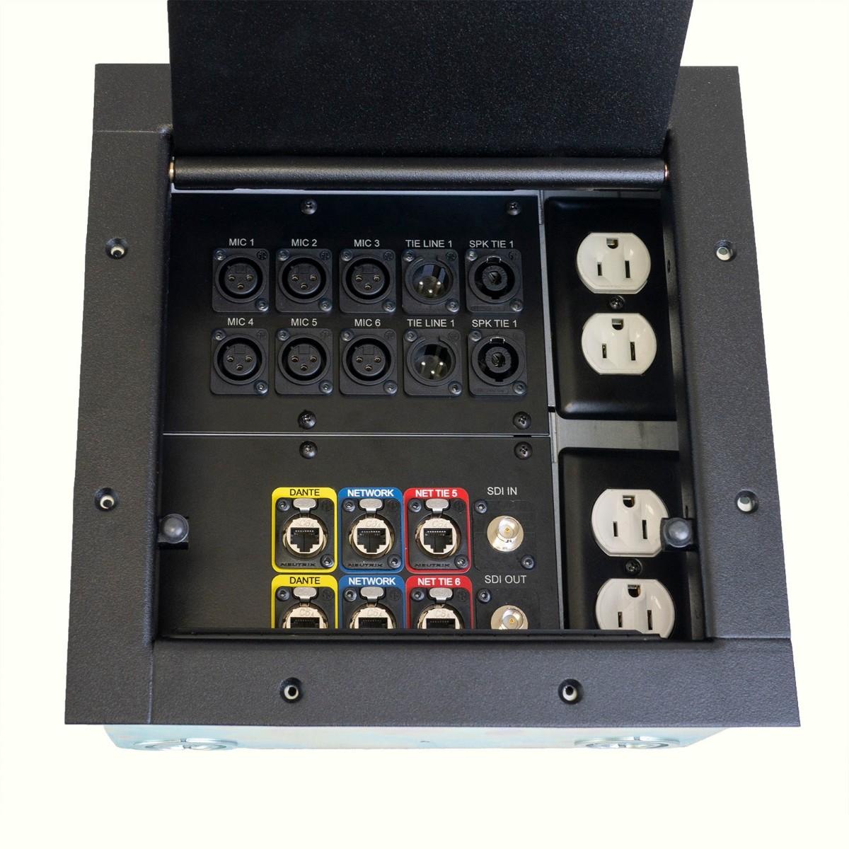 The Super Stage Pocket is designed to provide almost 3x the connectivity capacity compared with the similarly sized Full Stage Pocket. Engineered to include a horizontally mounted, isolated panel bracket between high and low voltage connections, this dual application pocket offers modular options that support application flexibility and multi-phase construction requirements. Customized connectivity is protected and concealed under the modified flush lid configuration providing more cable exit room and allowing a large quantity of cables to egress neatly onto the floor through the cable exit slot.