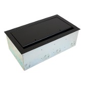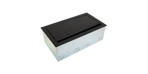 The extra large capacity Super Double Wide Stage Pocket features a horizontal panel design that allows up to 50 connectors in one floor box. Modular brackets can be added to provide high voltage AC isolation if power is required for dual application functionality. Customized connectivity is protected and concealed under the solid steel lid, allowing a large quantity of cables to egress onto the floor through the enlarged slotted Cable Exit. The Super Double Wide Pocket System is designed to support just in time delivery for multi-phase construction installation.
