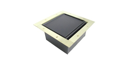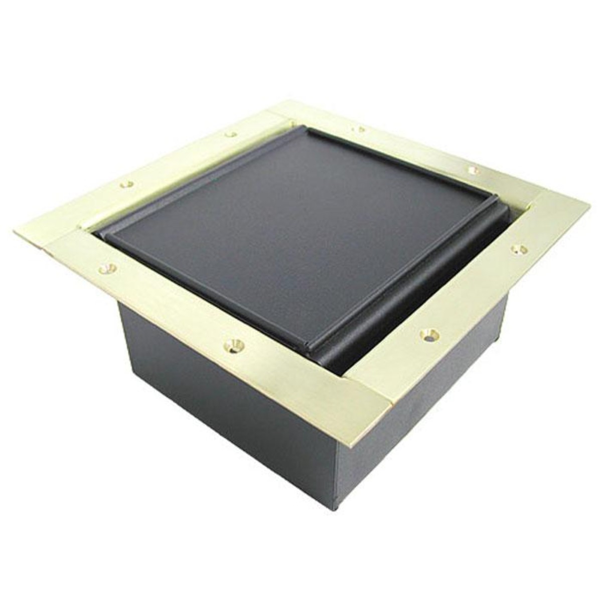 This Full Stage Pocket is used to conceal and protect high voltage and low voltage connections in this one dual application floor box. The slant panel configuration protects connectivity from damage and dust by placing connections upright, below the floor surface and under the recessed carpet lid. This lid option sits recessed in the pocket so when flooring is glued inside the rimmed lid edge, the covered black lid, brass pocket flange, and surrounding floor are visually flush. The Full Pocket is designed so terminated panels can be installed before or after pocket installation to support multi-phase construction applications.