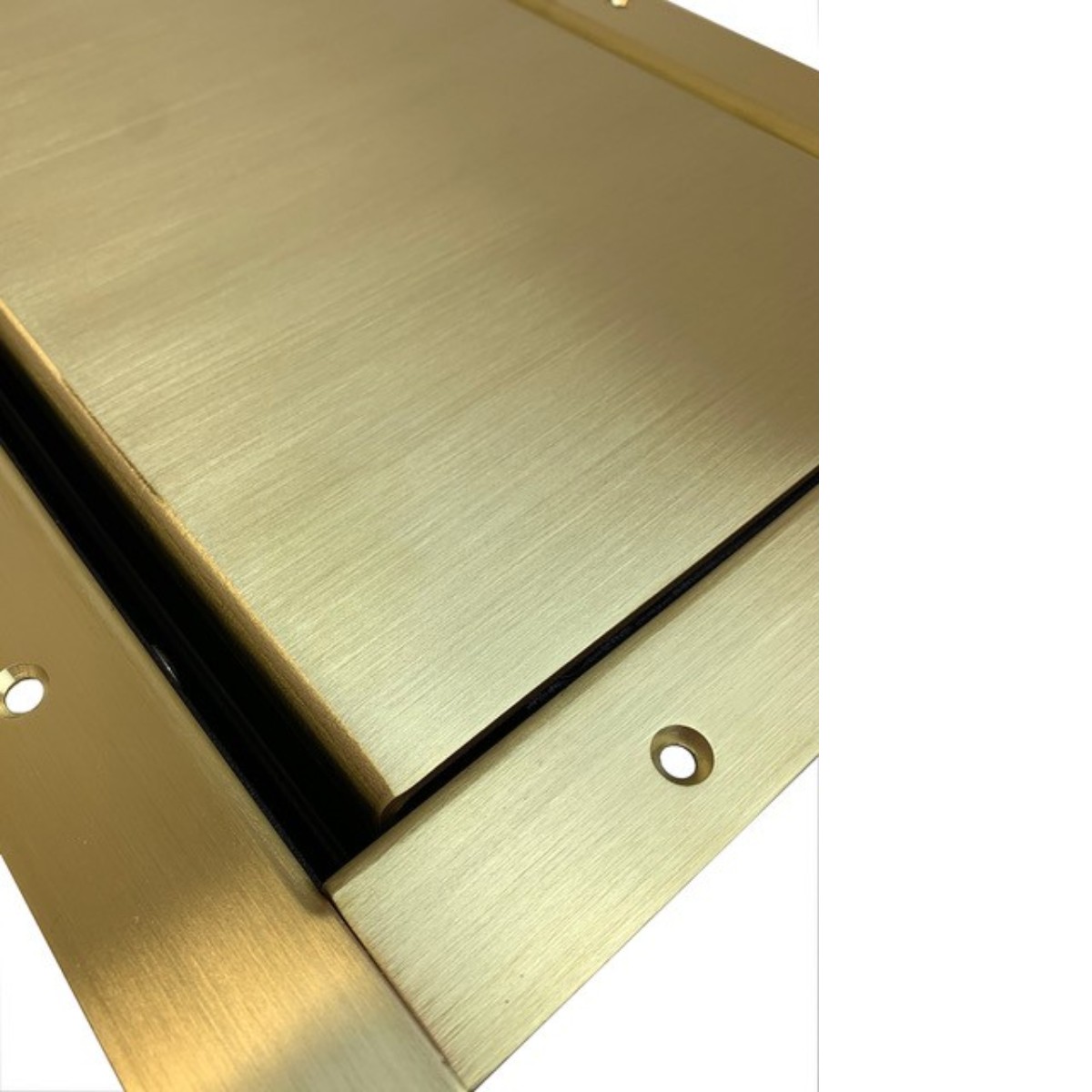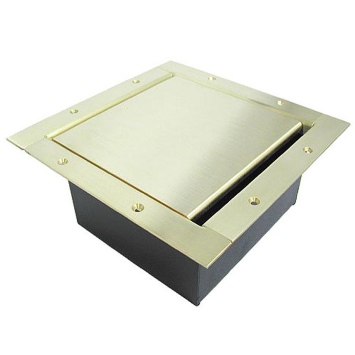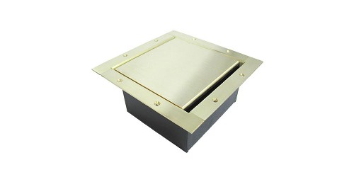 The Full Stage Pocket is used to conceal and protect high voltage and low voltage connections in this one dual application floor box. The slant panel configuration protects connectivity from damage and dust by placing connections upright, below the floor surface and under the brushed, flush mounted brass lid. Finished so the above floor lid and flange show solid brushed brass, this Full Pocket is designed so terminated panels can be installed before or after pocket installation to support multi-phase construction applications.