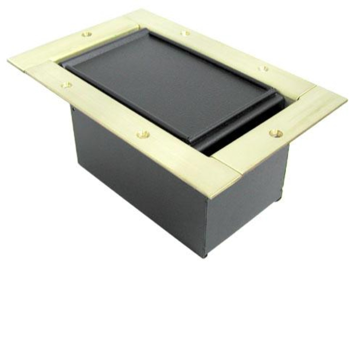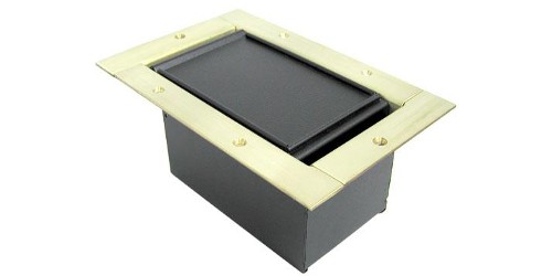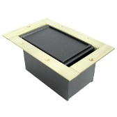 The Half Stage Pocket is made of heavy duty steel and is used to conceal and protect high voltage or low voltage connections in one floor box. The slant panel configuration protects connectivity from damage and dust by placing connections upright, below the floor surface and under the recessed carpet lid. This lid option sits recessed in the pocket so when flooring is glued inside the rimmed lid edge, the covered black lid, brass pocket flange, and surrounding floor are visually flush and esthetically constant. The Half Pocket is designed so terminated panels can be installed before or after pocket installation to support multi-phase construction applications.