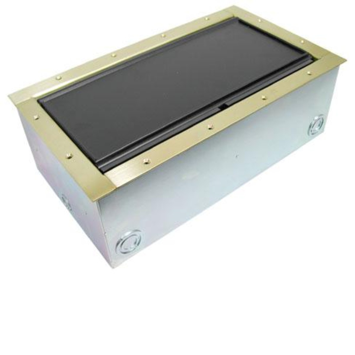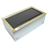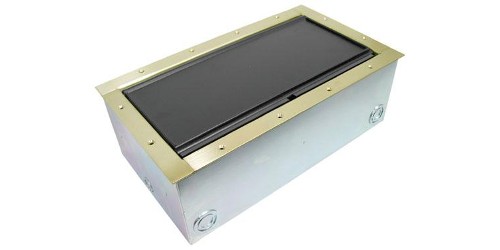 The extra large capacity Super Double Wide Stage Pocket features a horizontal panel design that allows up to 50 connectors in one floor box. Modular brackets can be added to provide high voltage AC isolation if power is required for dual application functionality. Customized connectivity is protected and concealed under the recessed carpet lid, allowing cables to egress onto the floor through the cable exit slot. This lid option sits below the pocket flange so when flooring is glued inside the rimmed lid edge, the covered black lid, brass pocket flange, and surrounding floor are visually flush and esthetically constant. The Super Double Wide Pocket System is designed to support just in time delivery for multi-phase construction installation.
