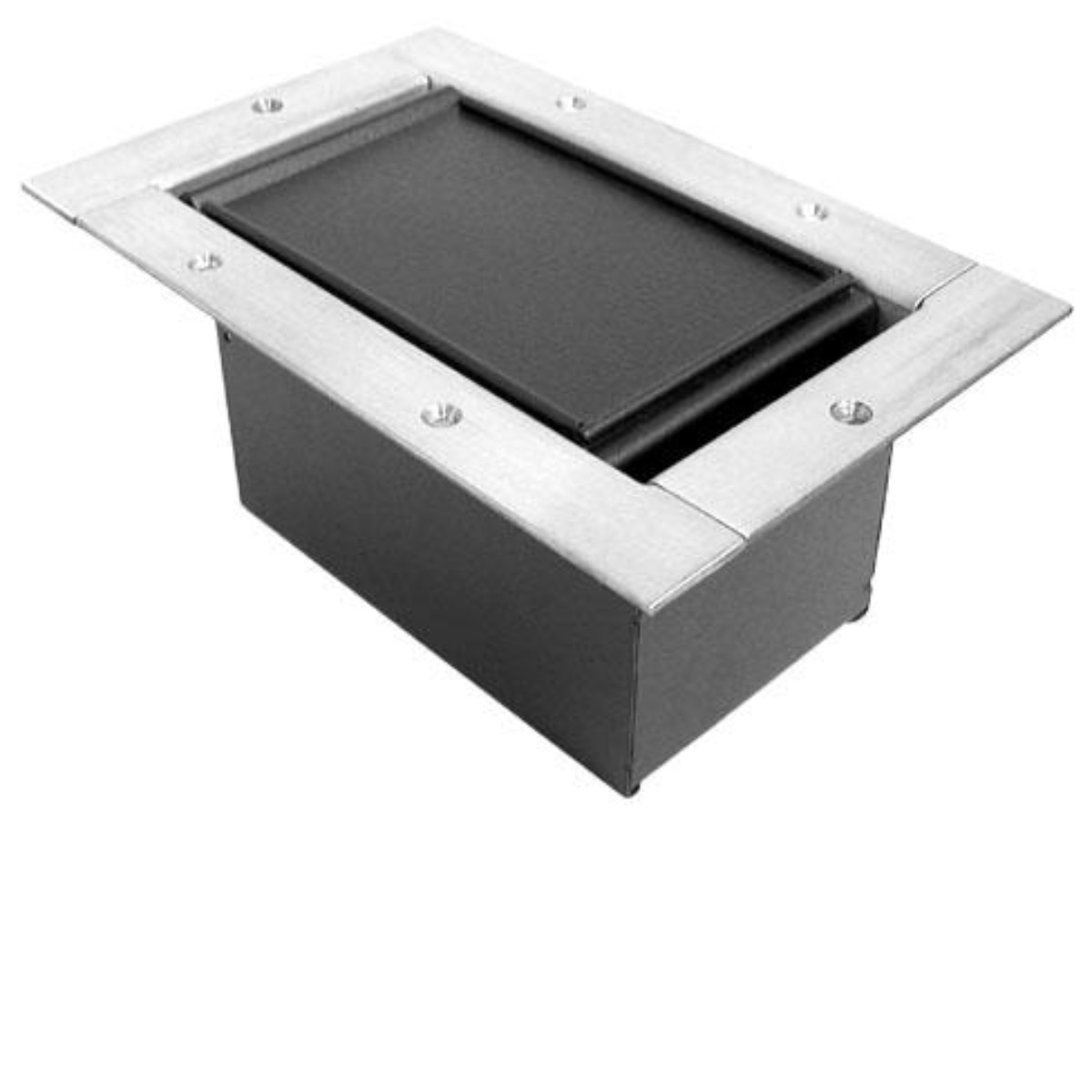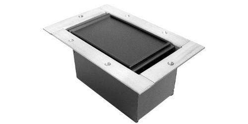 The Half Stage Pocket is made of heavy duty steel and is used to conceal and protect high voltage or low voltage connections in one floor box. The slant panel configuration protects connectivity from damage and dust by placing connections upright, below the floor surface and under the recessed carpet lid. This lid option sits recessed in the pocket so when flooring is glued inside the rimmed lid edge, the covered black lid, stainless steel pocket flange, and surrounding floor are visually flush and esthetically constant. The Half Pocket is designed so terminated panels can be installed before or after pocket installation to support multi-phase construction applications.