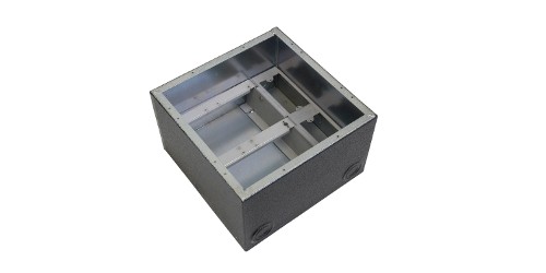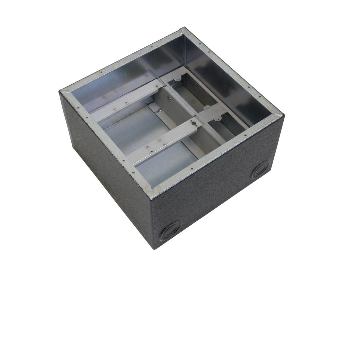 Always in stock and available for construction phase delivery, the Super Pocket back box Body arrives with mounted panel brackets and a temporary protective cover that is discarded when the above floor Bezel & Lid assembly (BZ132/BZ232/BZ332) is installed. Wet back boxes are ASTM electrodeposited with clear zinc for corrosion protection before an additional jacket of polyurethane is applied to provide moisture resistance to the box.