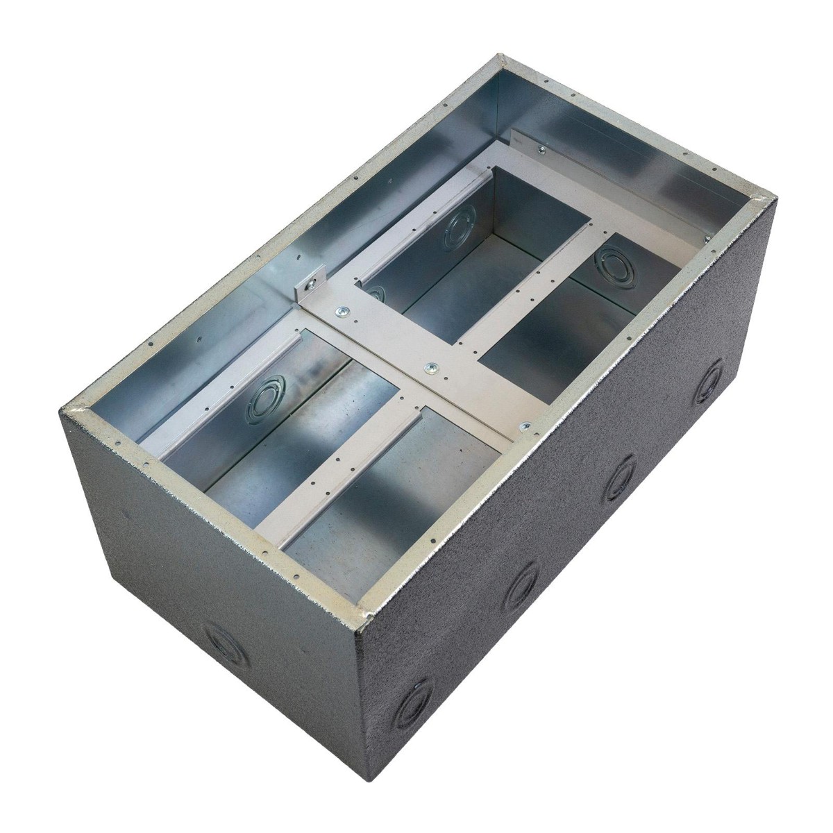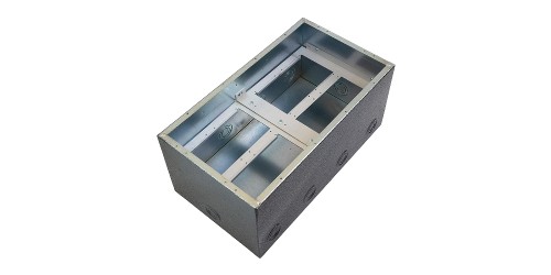 Super Double Wide Pocket Bodies are heavy duty welded 14 gauge steel and provide almost 2x the connectivity capacity compared to the similarly sized Double Wide Stage Pocket. Always in stock and available for construction phase delivery, the Super DW Pocket back box Body arrives with mounted panel brackets and a temporary protective cover that is discarded when the above floor Bezel & Lid assembly (BZ134/BZ234/BZ334) is installed. Wet back boxes are ASTM electrodeposited with clear zinc for corrosion protection before an additional jacket of polyurethane is applied to provide moisture resistance to the box.