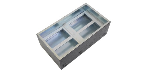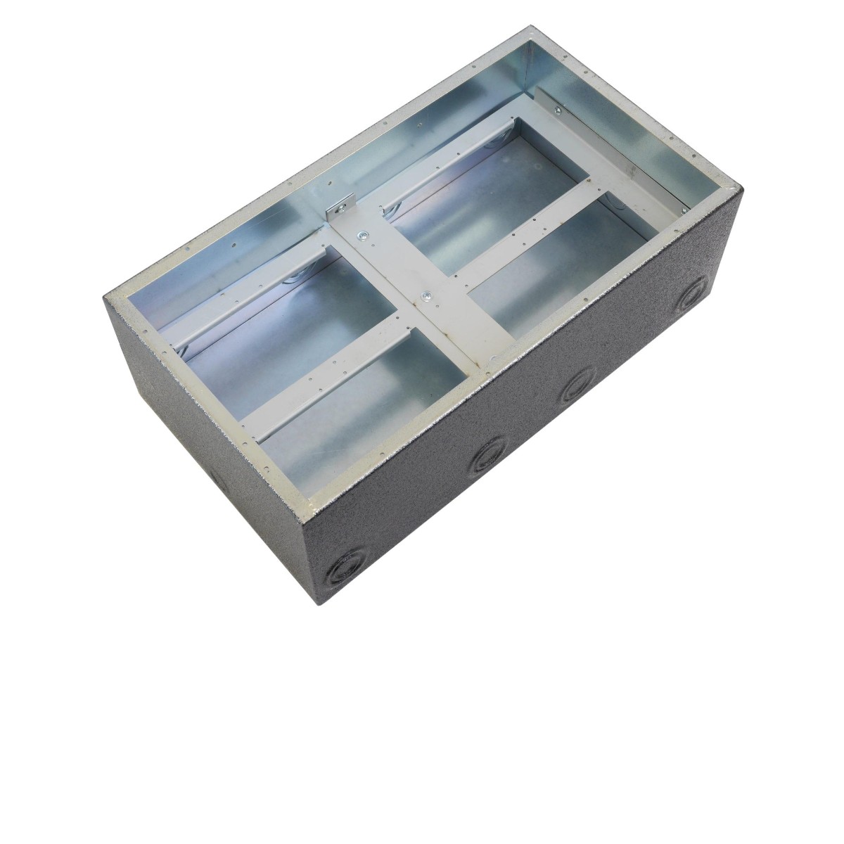 Super Double Wide Pocket Bodies are heavy duty welded 14 gauge steel and provide almost 2x the connectivity capacity compared to the similarly sized Double Wide Stage Pocket. Always in stock and available for construction phase delivery, the Super DW Pocket back box Body arrives with mounted panel brackets and a temporary protective cover that is discarded when the above floor Bezel & Lid assembly (BZ134/BZ234/BZ334) is installed. Wet back boxes are ASTM electrodeposited with clear zinc for corrosion protection before an additional jacket of polyurethane is applied to provide moisture resistance to the box.