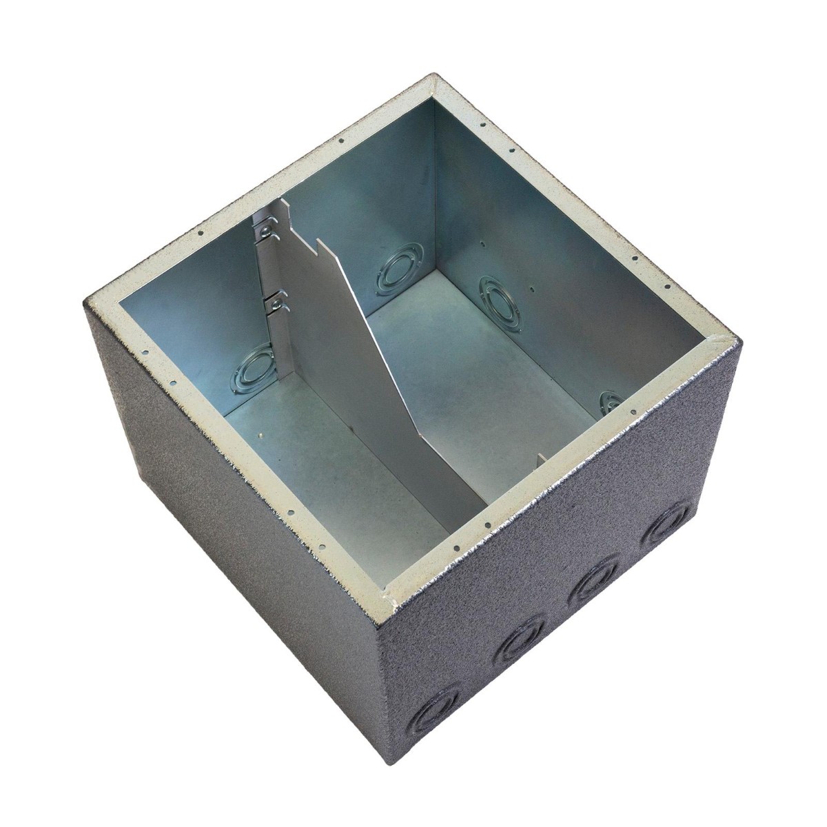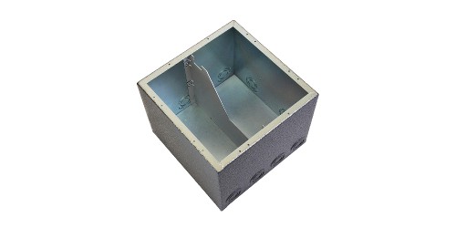 Rough in boxes are heavy duty welded 14 gauge steel and mate exclusively with all Full Stage Pockets to support conduit connection, voltage isolation, and to protect the stage pocket under the floor surface. Always in stock for onsite delivery, back boxes arrive complete with a temporary protective cover that is discarded when the pocket is installed. Wet back boxes are ASTM electrodeposited with clear zinc for corrosion protection before an additional jacket of polyurethane is applied to provide moisture resistance to the box.