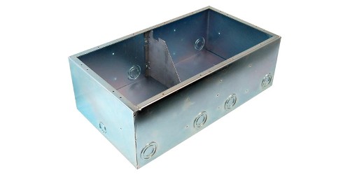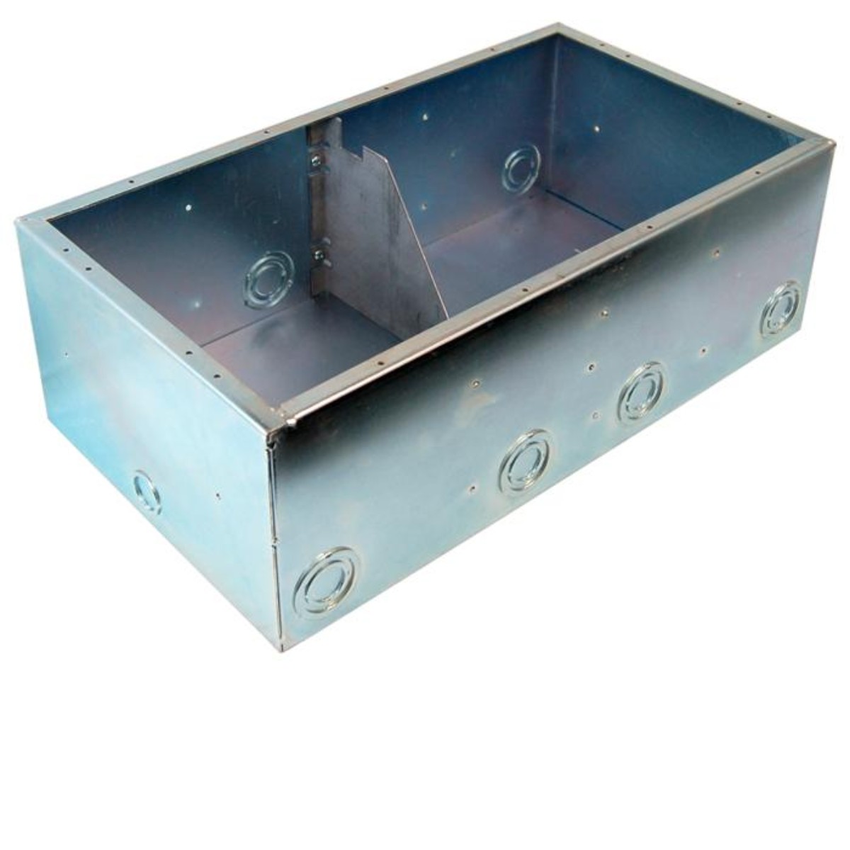 Rough in boxes are heavy duty welded 14 gauge steel and mate exclusively with all Double Wide Stage Pockets to support conduit connection, voltage isolation, and to protect the stage pocket under the floor surface. Always in stock for onsite delivery, back boxes arrive complete with a temporary protective cover that is discarded when the pocket is installed. All 6" deep back boxes are ASTM electrodeposited with clear zinc for corrosion protection to military standards and are UL Listed, having been safety tested against nationally recognized standards.