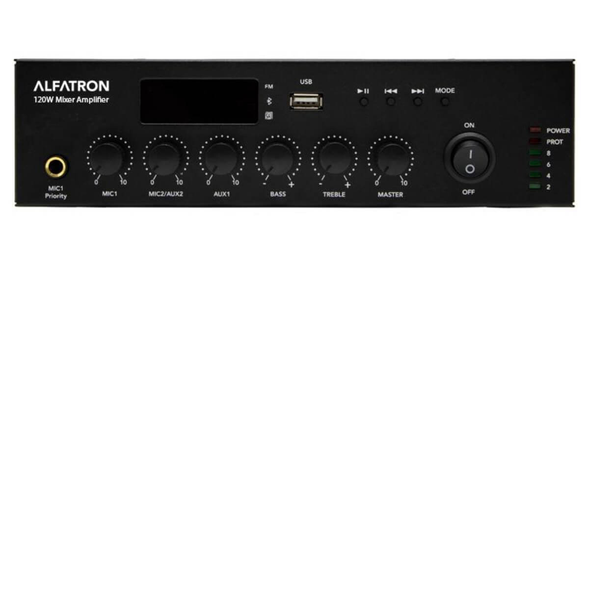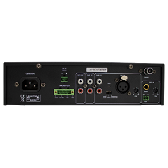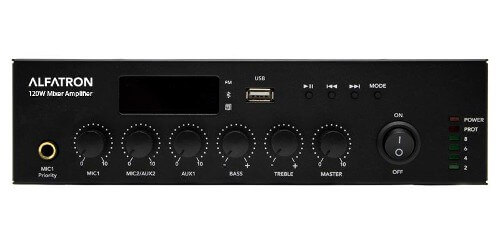 The ALF-120W-UB Compact Mixer amplifier has a built-in Media player with Bluetooth, onboard FM tuner and MP3 player. Front panel microphone input with priority function, and rear panel balanced microphone input with phantom power. Emergency input function. Dual RCA line inputs and RCA aux out. 120W at 70/100V and 4-16 Ohms, 24V backup power input, This is a Class-D Amplifier.