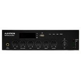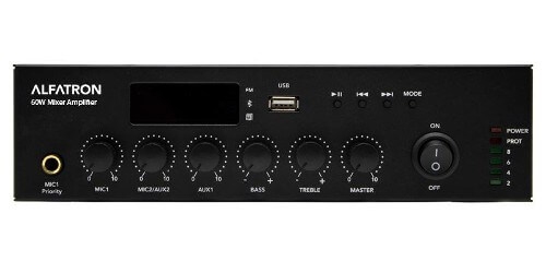The ALF-60W-UB Compact Mixer amplifier has a built-in Media player with Bluetooth, onboard tuner and MP3 player. Front panel microphone input with priority function, rear panel balanced microphone input with phantom power. Emergency input function. Dual RCA line inputs and RCA aux out. 60W at 70/100V and 4-16 Ohms, 24V backup power input, This is a Class-D Amplifier.