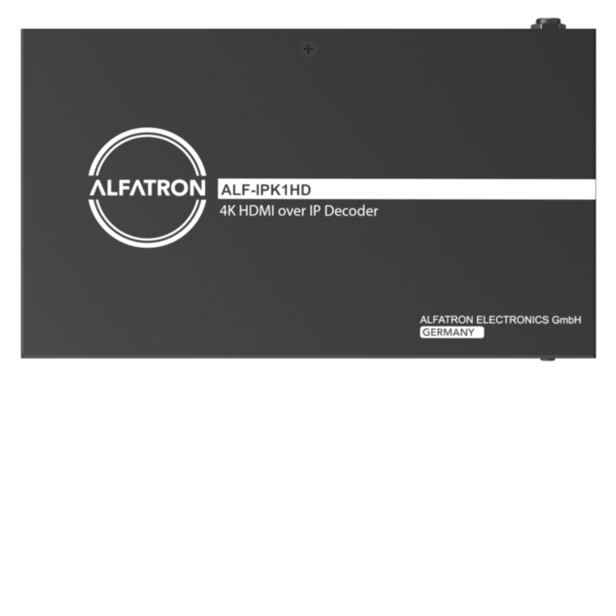 The ALF-IPK1HD is a 4K networked AV over IP decoder adopting the latest H.265 compression. The decoder can be configured in an IP video matrix or video wall setup using the VDirector mobile app (IOS).Works easily with an Ethernet switch, no need to configure IPs, real plug and play solution. Supports high-efficiency H.264/265 video codec with MPEG4-AAC and LPCM stereo audio. Built-in scaler for fast and seamless switching. RS-232 route follows the switching of video source. INPUT: 1 x LAN (PoE) OUTPUT: 1 x HDMI, 1 x Line out, 1 x RS-232