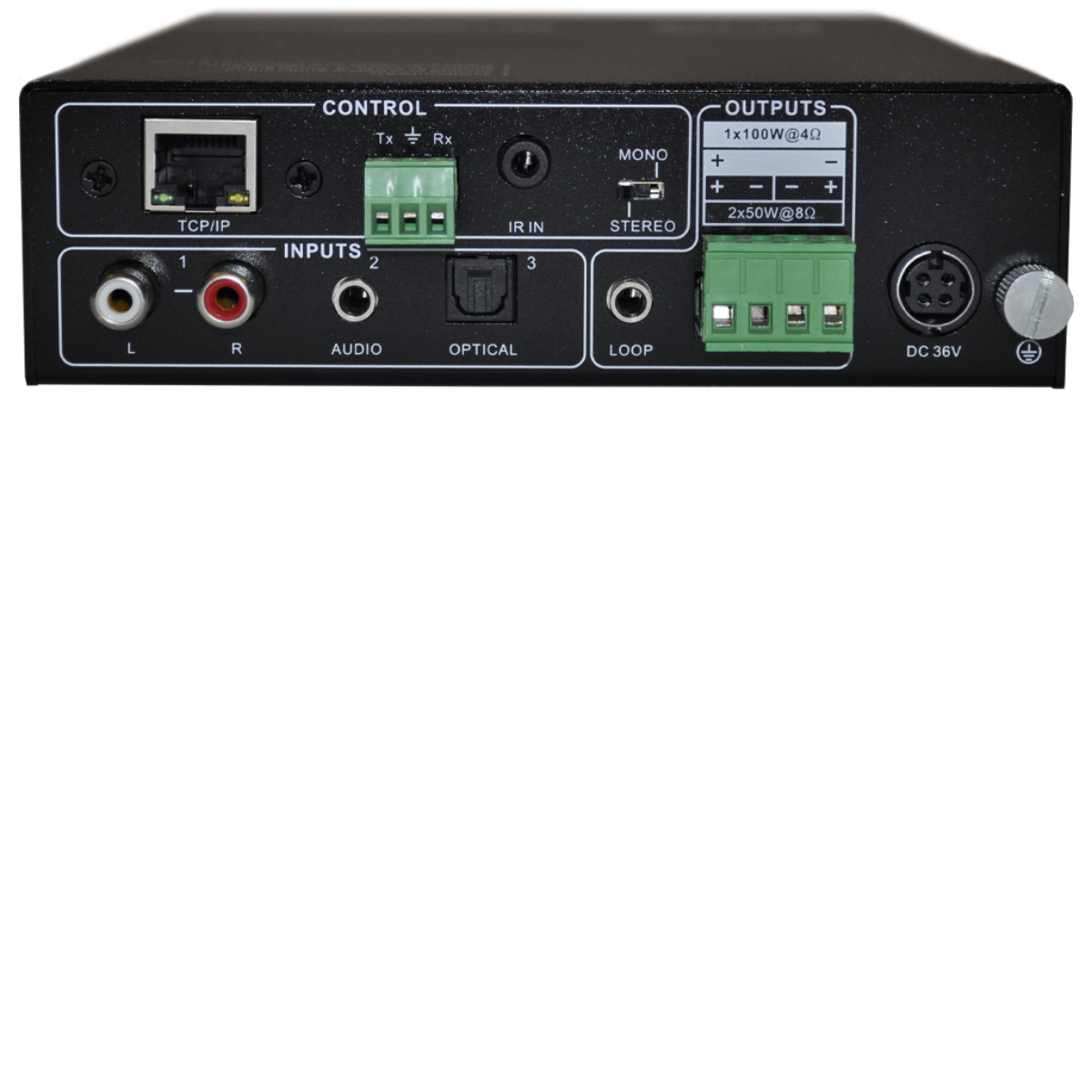 The ALF-PA100W is a compact-sized digital amplifier (Class-D) with 3 inputs (1 L+R stereo audio, 1 analog audio, 1 optical fiber audio).