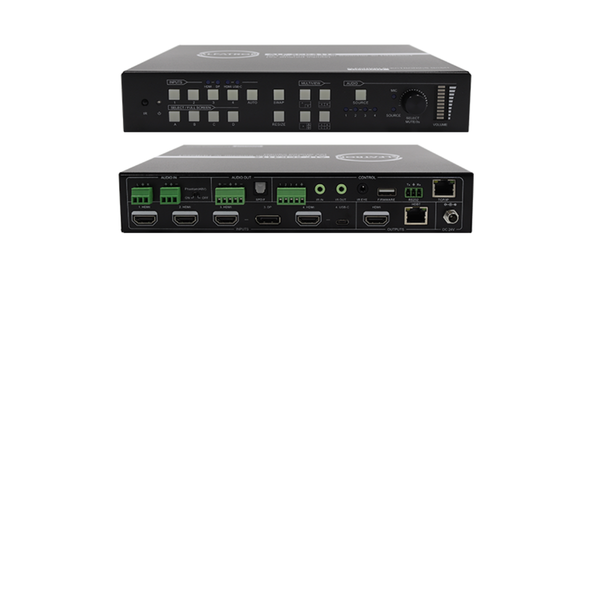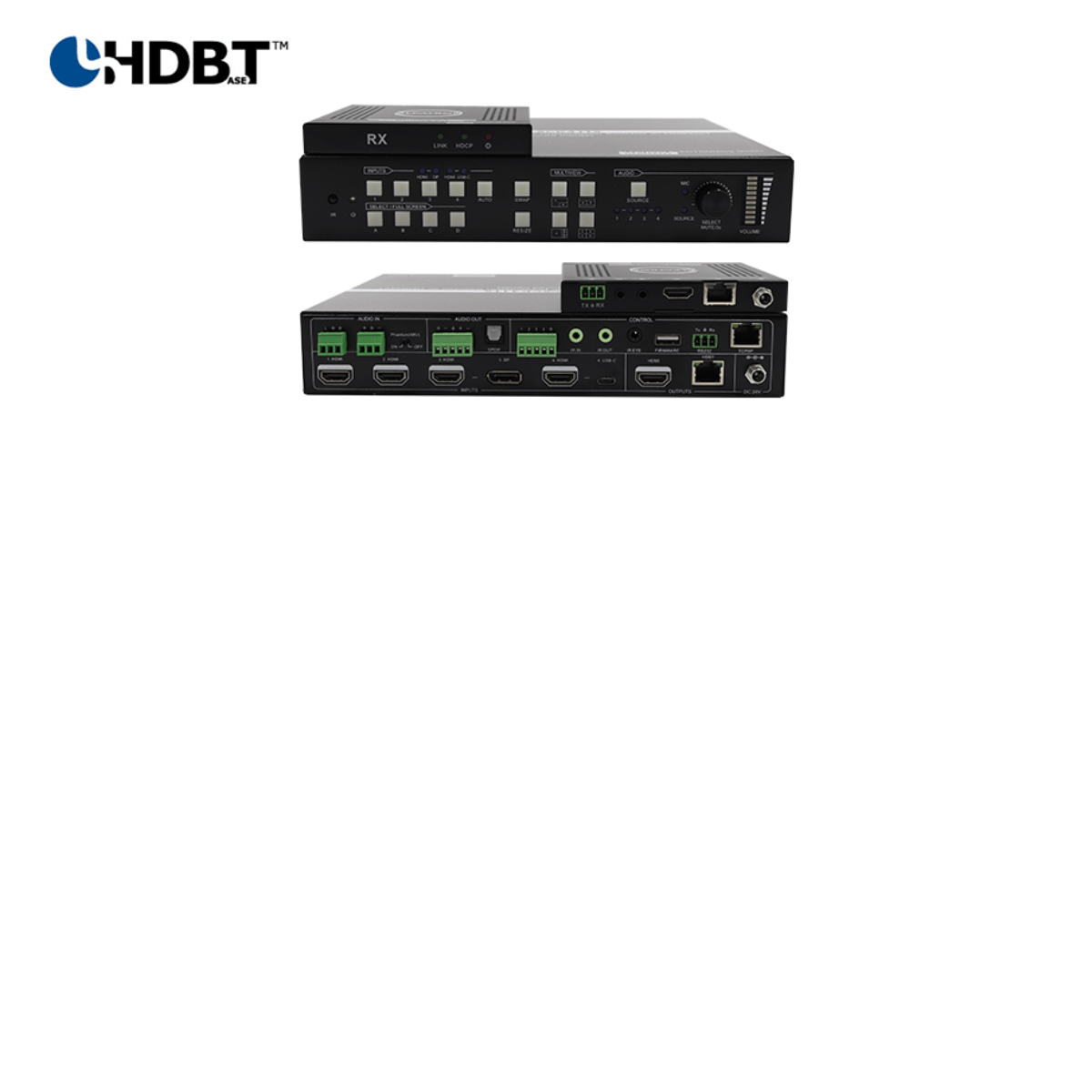 Seamless switcher with 4 inputs. HDMI & HDBaseT outputs. Includes receiver.