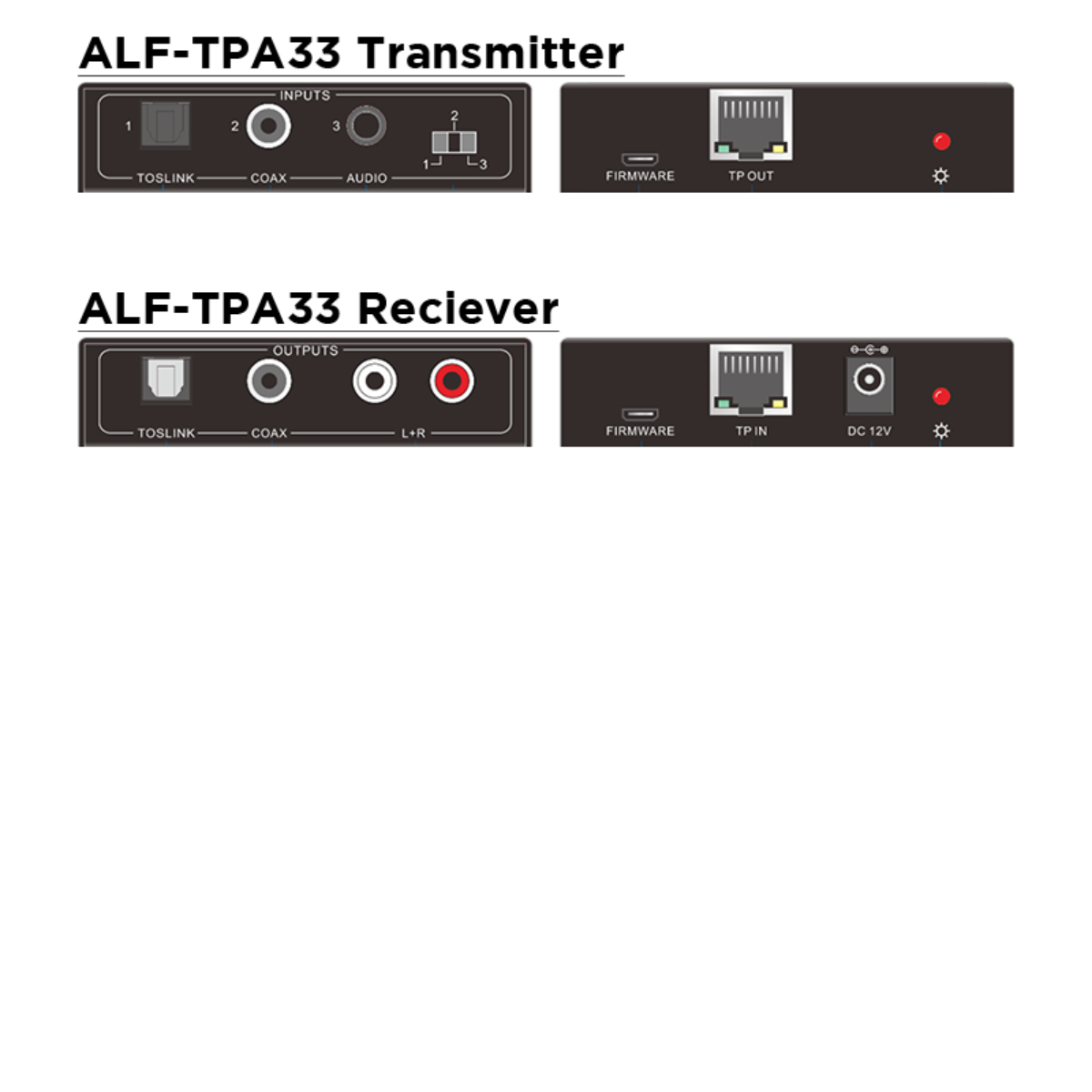 The TPA33 is an audio extender set, comprising of a Transmitter and Receiver. It extends a stereo analogue audio signal up to 170m, and a TOSLINK or COAX digital audio signal up to 290m via a single CAT6 cable