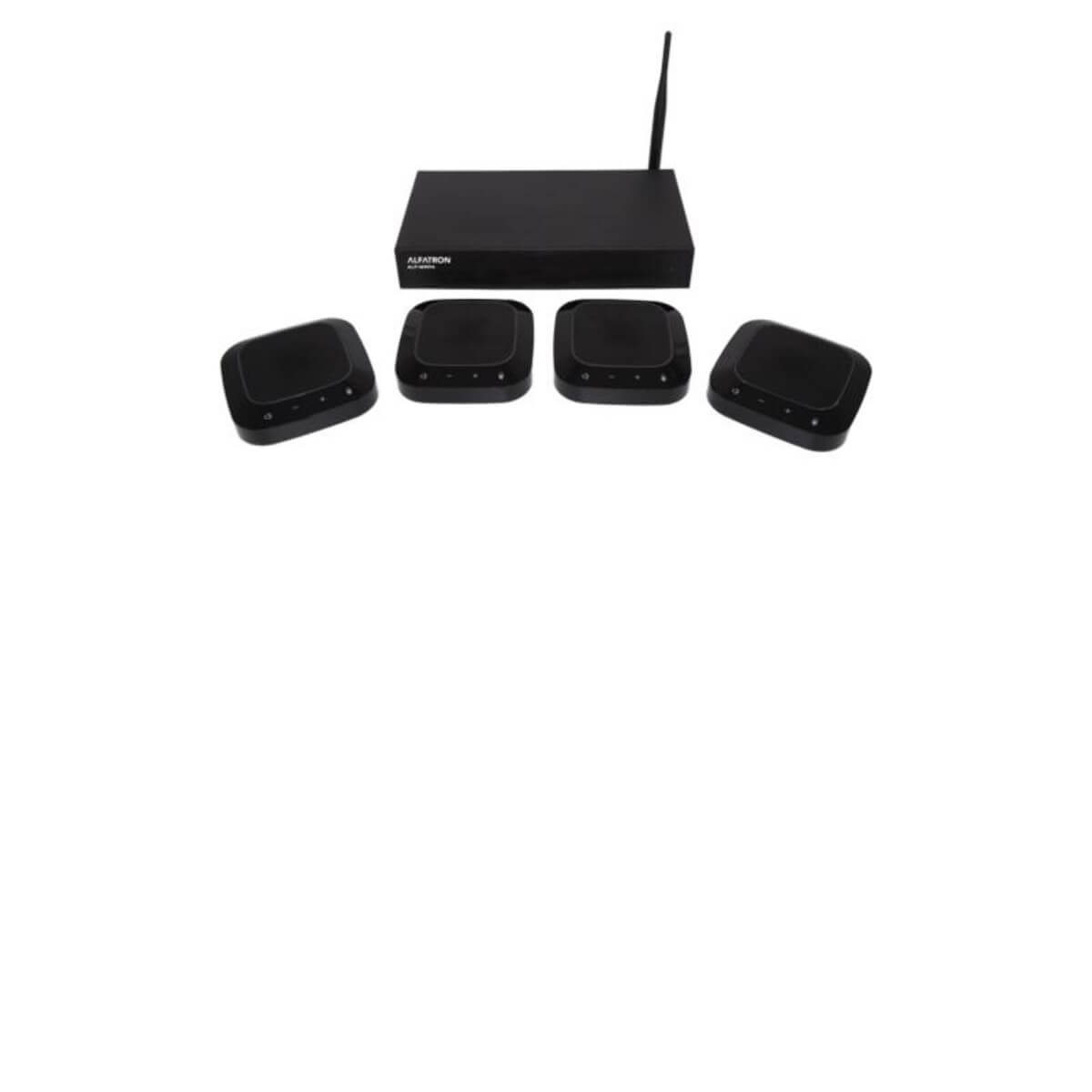 The ALF-WMP4 is a wireless microphone system with a controller and four 2.4GHz wireless microphones. The controller can be connected to an amplifier or powered speakers. It has a USB connection to connect to conferencing software like Teams and Zoom and a Wireless handheld microphone input.
