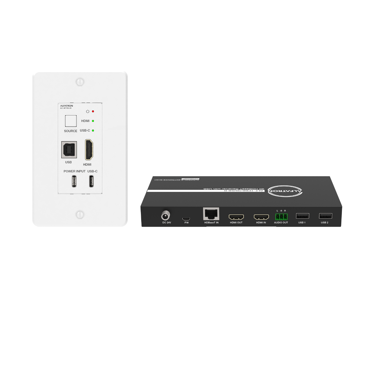The ALF-WP70S-UB wall plate is a 2×1 switcher and HDBaseT transmitter with an HDMI, USB-B and USB-C input. It features a US one-gang enclosure for Decora-style wall plate openings with interchangeable black and white wall plates and faceplates. The USB-C input provides an ideal AV interface for connecting with new Apple MAC notebooks and Windows computers as well as smartphones and tablets. Supports video resolution up to 4K@60Hz 4:4:4. The product is remotely powered via the receiver.