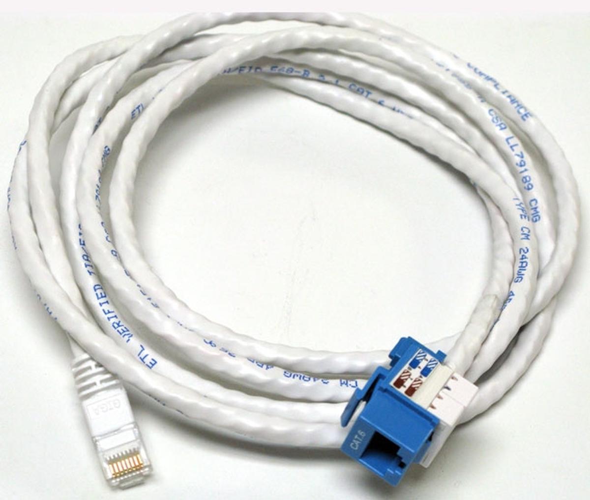 The Altinex CM11355 is a blue RJ-45 female snap-in assembly, including six foot CAT-6 cable with an RJ-45 male end.