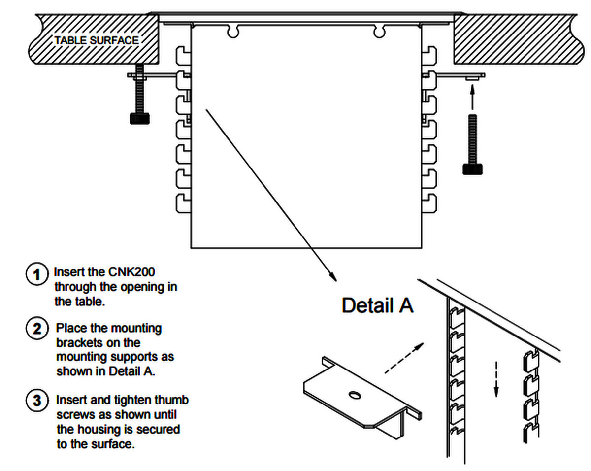 To install cut your hole with the cutout template and drop in, then secure to the underside of the table with the included mounting hardware.