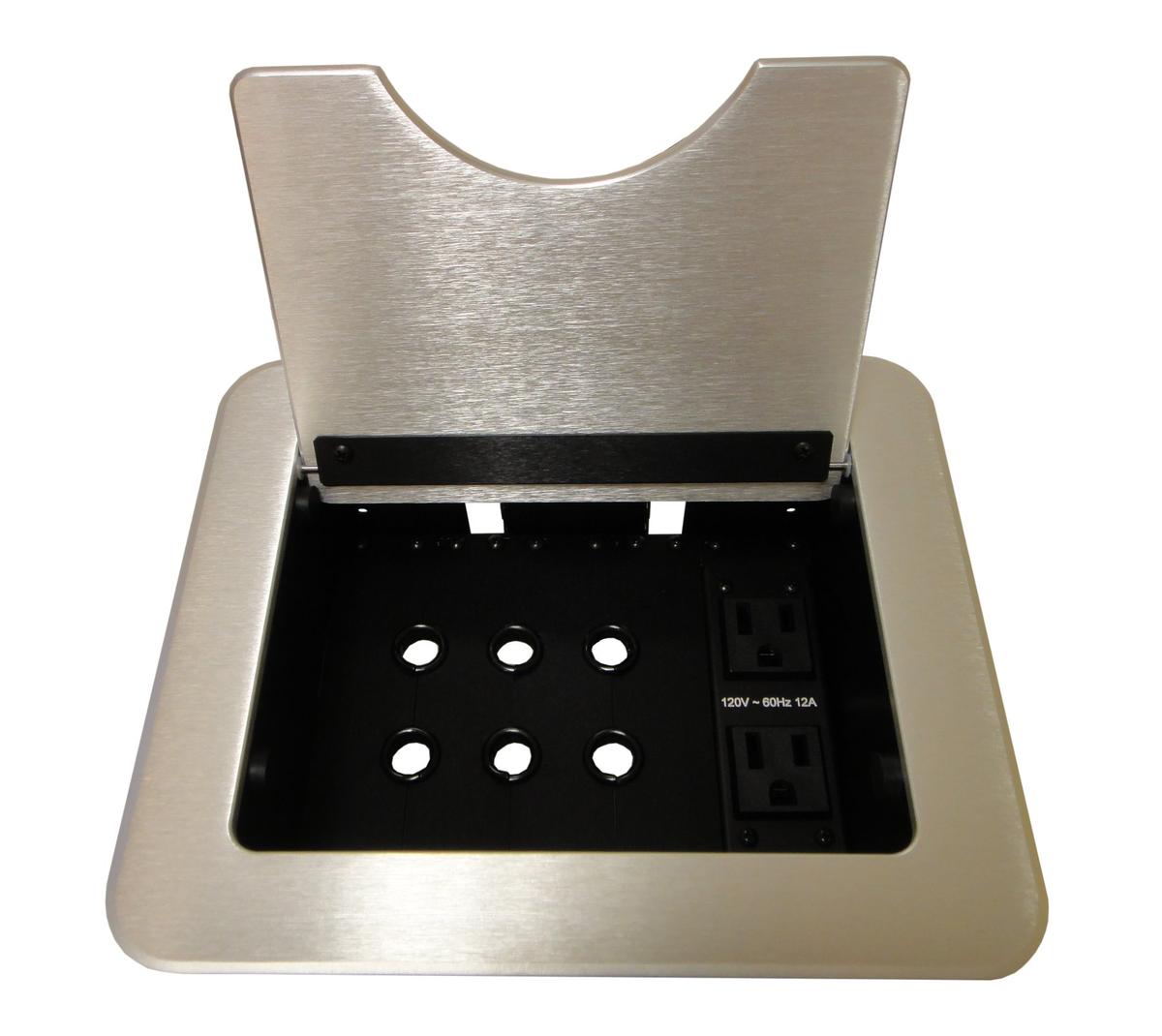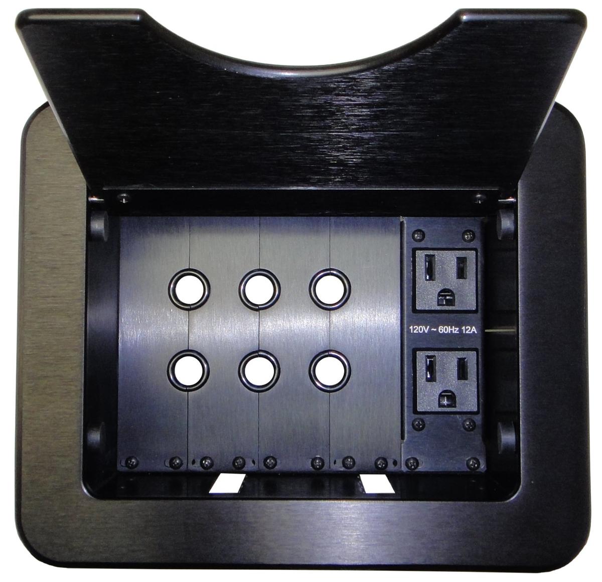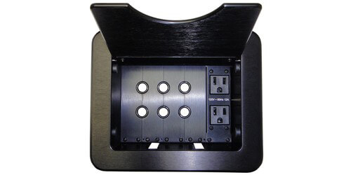The Altinex CNK260 Cable-Nook gives you a simple, useful way of retaining cable ends. A cable-nook uses a trapdoor style half-moon lid which stays flush with your table surface when not in use. Inside the box you will find 2 power outlets and 6 grommet holes. The retaining grommets provide 6 holes for your cable ends, the half moon lid allows cables to be plugged in the with lid closed.