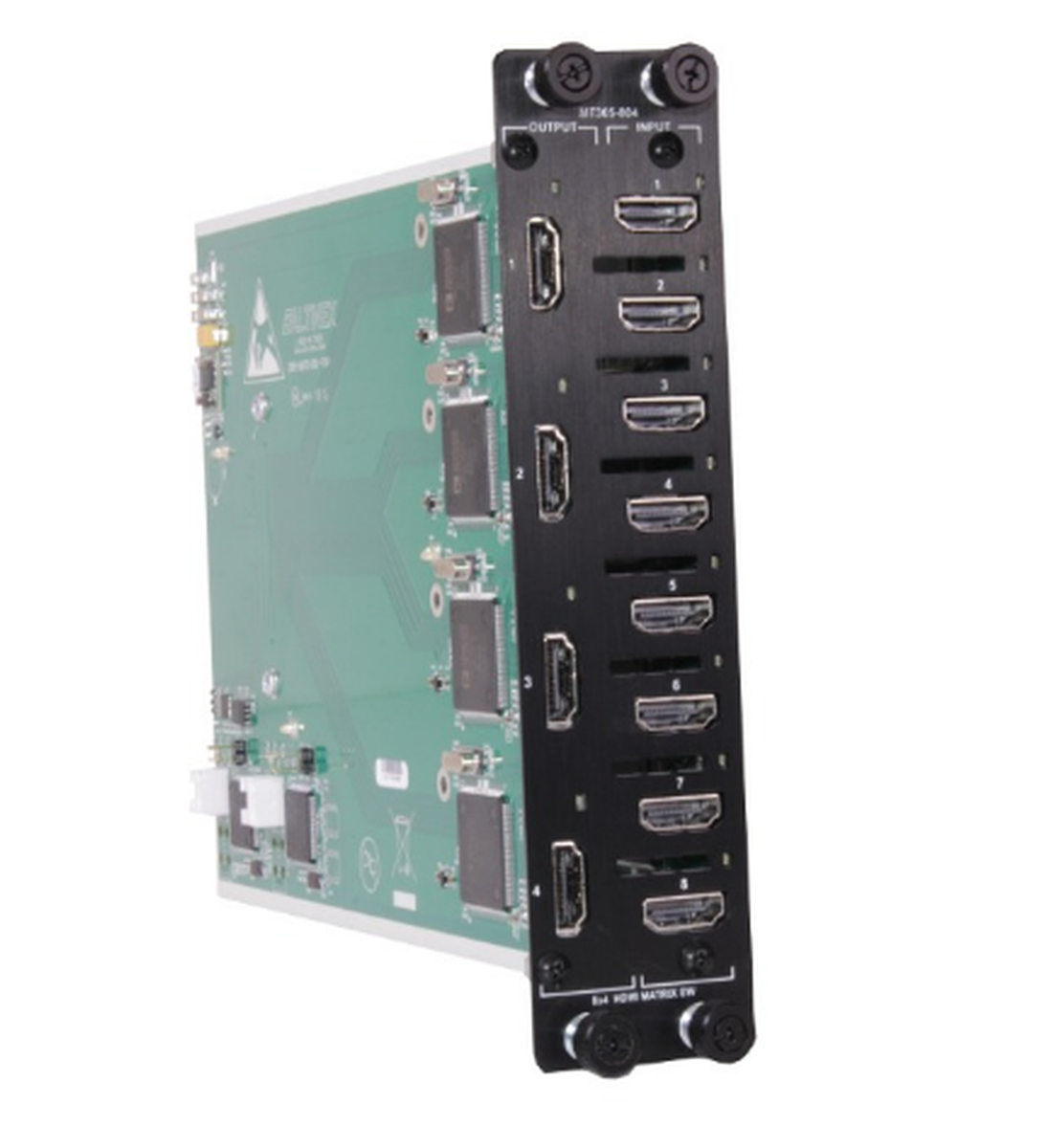 The Altinex MT305-804 is a 8x4 HDMI Matrix Switcher Card that was designed for use with Altinex MultiTasker enclosures, such as the MT302-201. This card features 8 HDMI inputs, and 4 HDMI outputs and is HDCP compliant. The matrix switcher card works by taking any of the 4 HDMI inputs and sending it to any of the 8 HDMI outputs. It uses a 400mA Output current, and offers front panel signal status LED's for active connections.