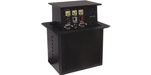 The Altinex PNP402 Pop’ N Plug interconnect box "Pops Up" from the conference table providing access to connectors and when pressed back down is concealed flush with the tabletop surface. The unit is dual sided so both sides of the table will always have access to their table box connections. Choose from black anodized aluminum or silver anodized aluminum, both come in a brushed finish.