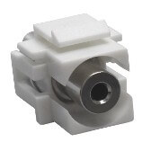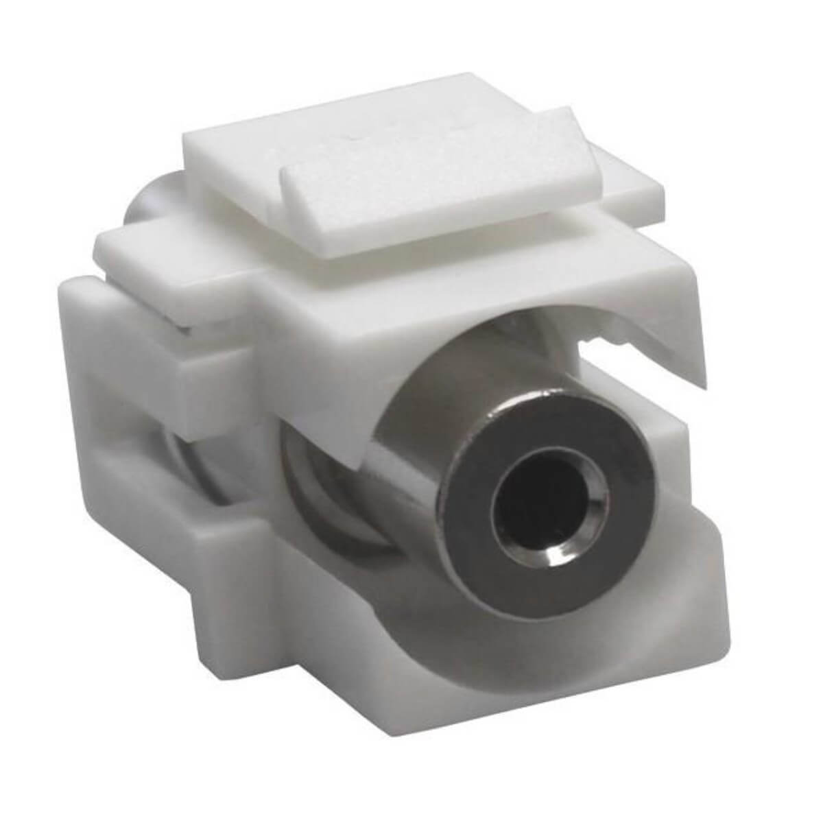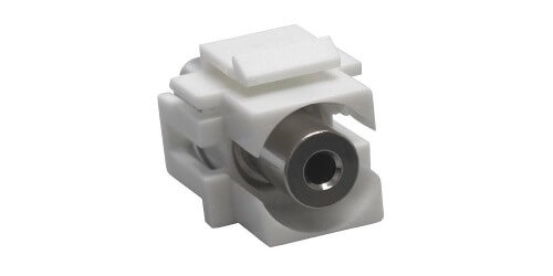 The SN1305-AU-W is a 3.5 mm audio Keystone snap-in coupler that fits into snap-in ports of the TB120-X01 and TB120-X03 Table Buddy sectional plates. This coupler is designed for a 3.5mm stereo connection and enables the pass-through of audio signals from the top of the table to the bottom side of the table. It is made of black plastic, with nickel-plated connector body and gold-plated internal contacts. The connector is rated for over 1 million plug-in operations.
