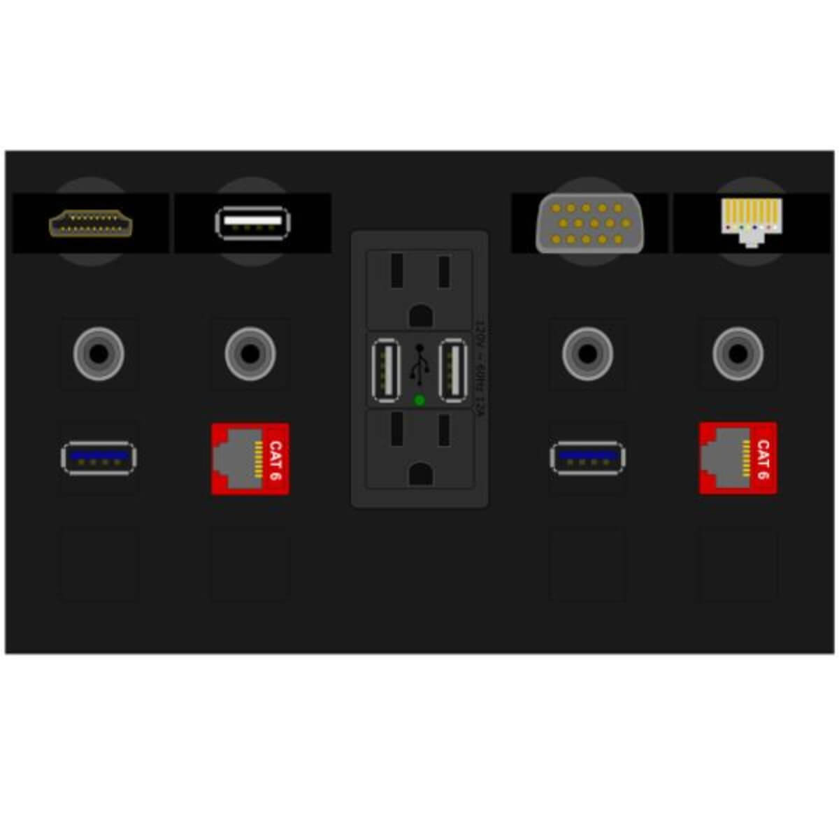 - Two USB ports, 3 Amps total, 5VDC, Type A, 2.0