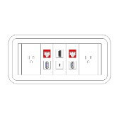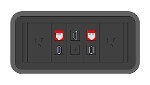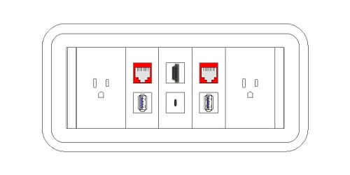 The Altinex TB100-101 unit is pre-configured with 2 U.S. power, 2 1/4-inch wide blank plates, and 3 double snap-in connector plates which are pre-populated with the following snap-in connectors: 2 RJ-45, 2 USB-A 3.0, 1 HDMI, and 1 USB-C. The snap-in modules are pre-installed in the TB100-101 modular unit frame and is flush with the surface of the unit coupler connectors, allowing cables to connect to the presentation system underneath the surface and have easy user access to connectors on the table’s surface.