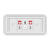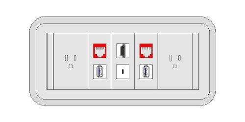 The Altinex TB100-201 unit is pre-configured with 2 U.S. power, 2 1/4-inch wide blank plates, and 3 double snap-in connector plates which are pre-populated with the following snap-in connectors: 2 RJ-45, 2 USB-A 3.0, 1 HDMI, and 1 USB-C. The snap-in modules are pre-installed in the TB100-201 modular unit frame and is flush with the surface of the unit coupler connectors, allowing cables to connect to the presentation system underneath the surface and have easy user access to connectors on the table’s surface.