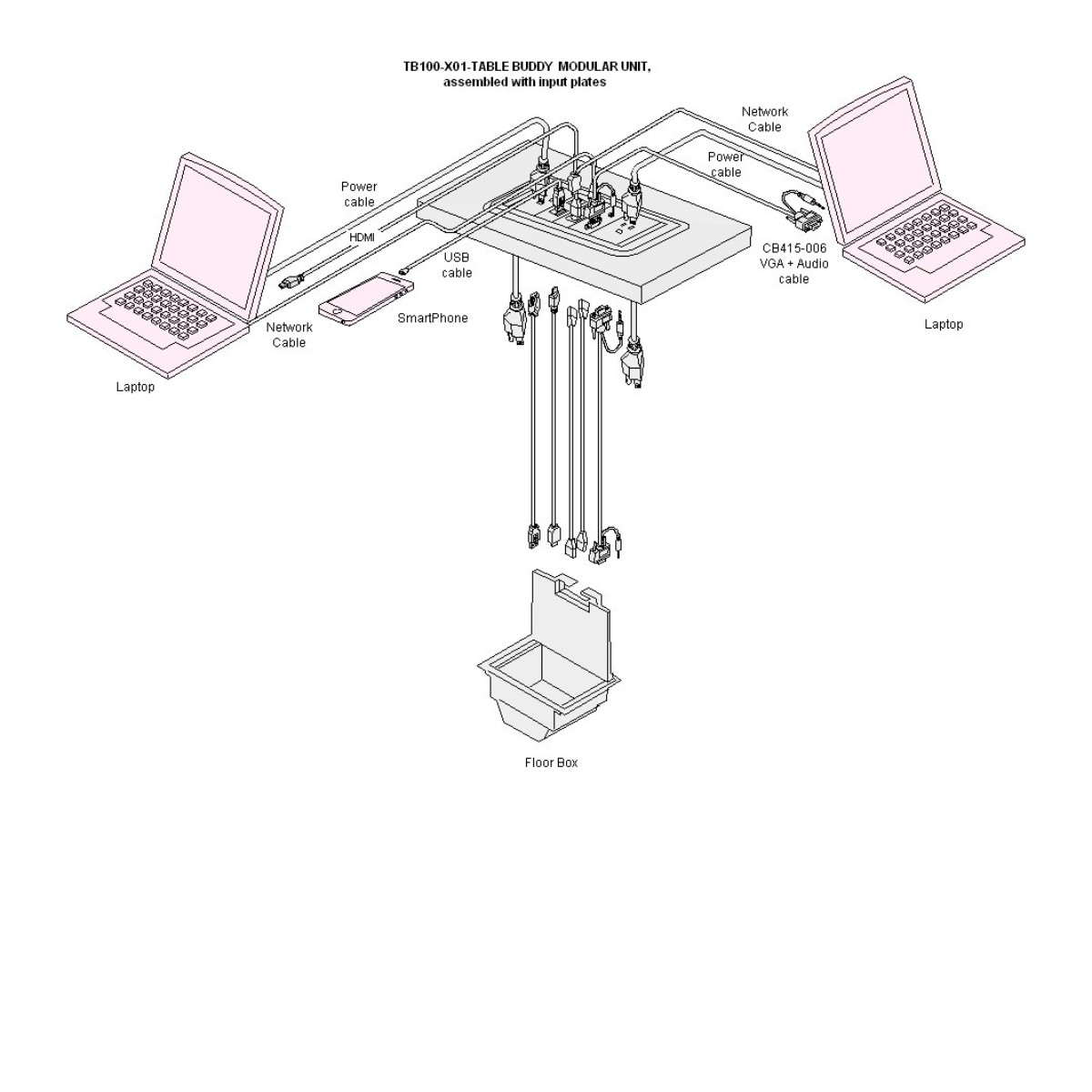 The TB100-201 is a pre-configured interconnect unit, designed for boardroom and conference rooms. Cables for a presentation system are connected to the connectors on the snap-in modules, enabling the user easy access for connections of AC power, video, audio, and the other media sources from the top of the table.
