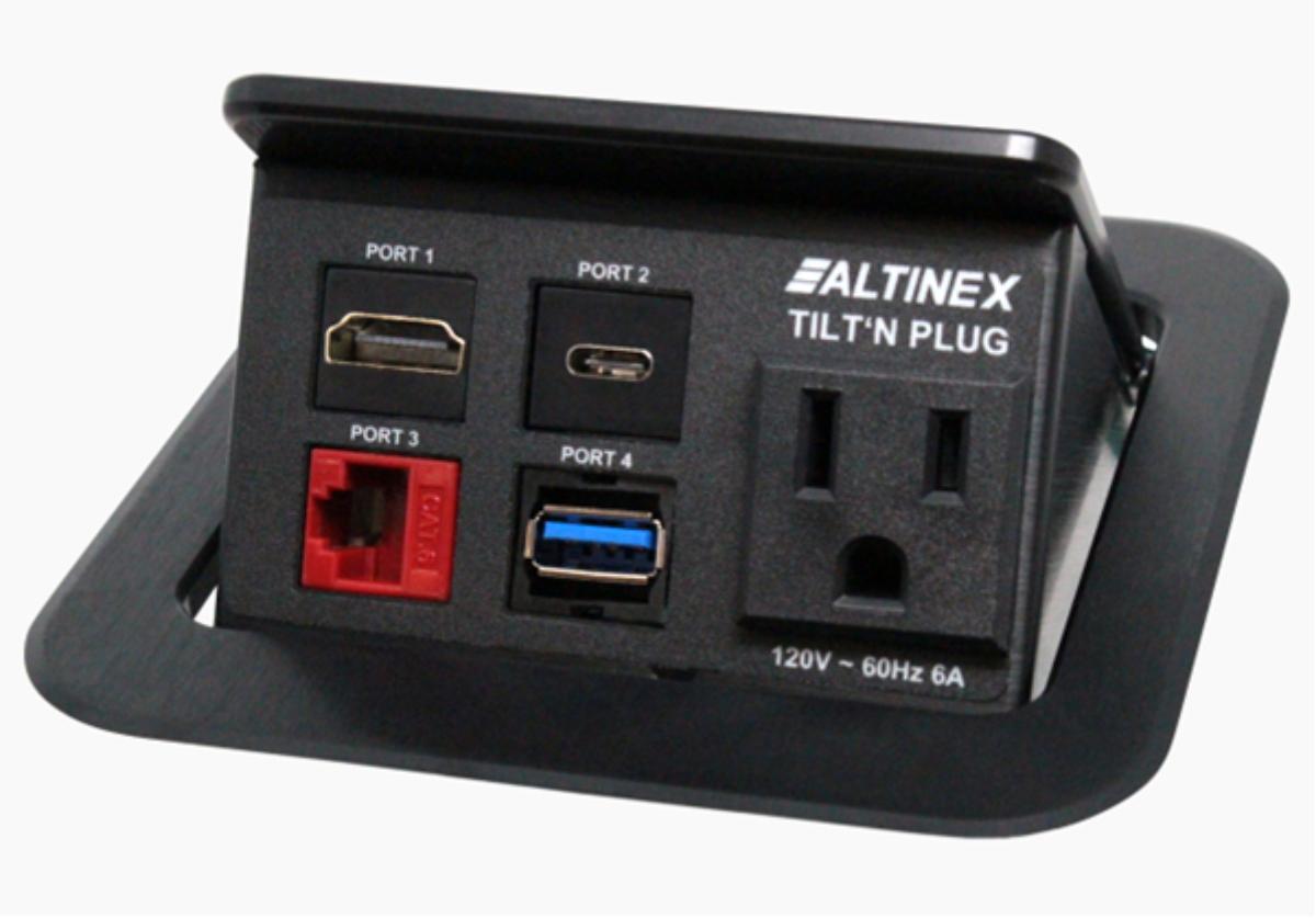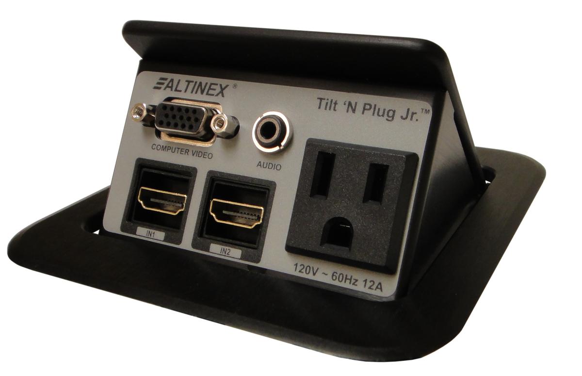 The Altinex TNP120C features 1 power and your choice of 4 other connectors, choose the connections you need. Use our customizer to build your perfect table box, just click on the connections to start. Typical lead time to custom build your box before shipping out takes around 2 to 3 days. All connections at the box are female, under the table are 6' male terminated cables with the power being 9' long. Choose from a gorgeous black anodized aluminum or silver anodized aluminum finish to compliment the look of any room.