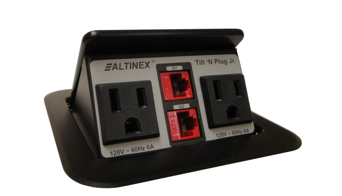 The Altinex Tilt 'N Plug Jr TNP151 installs flush in your table but when pressed tilts and pops open via a gas spring. The TNP151 provides 2 Cat6 and 2 AC power connectors. The data cables are 6' long with male terminated ends while the power is 9' and only one cable. You can choose from black anodized aluminum or silver anodized aluminum colors for the same price.