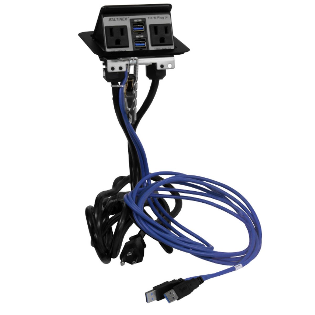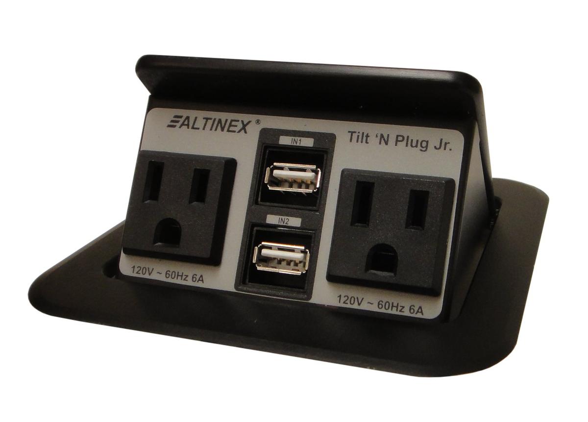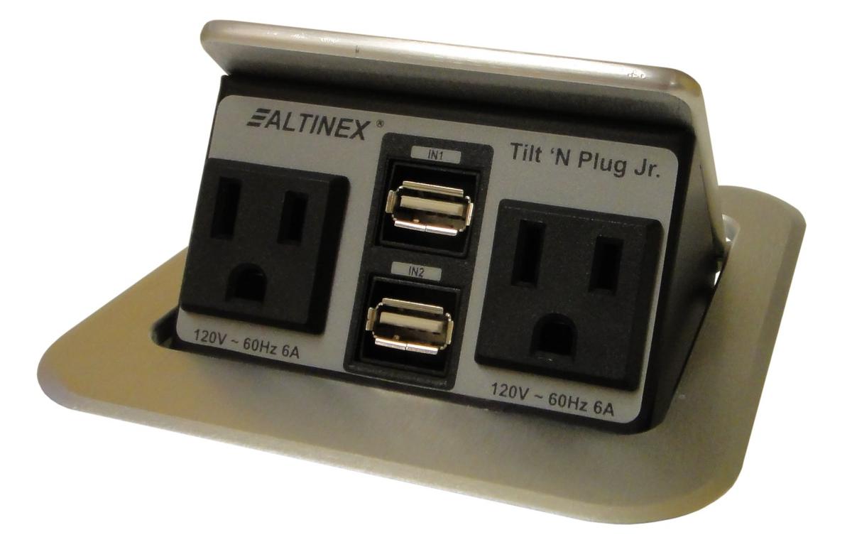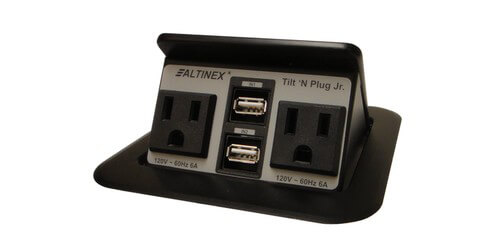 The Altinex Tilt 'N Plug Jr TNP155 installs flush in your table but when pressed tilts and pops open via a gas spring. The TNP155 provides 2 charging USB and 2 AC power connectors. The charging USB is powered via the included PS5594UB 5-port charging hub, the hub provides integrated smart charging to ensure your devices get the correct amperage and charge as fast as possible. You can choose from black anodized aluminum or silver anodized aluminum colors to meet the look of your room.