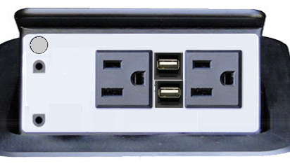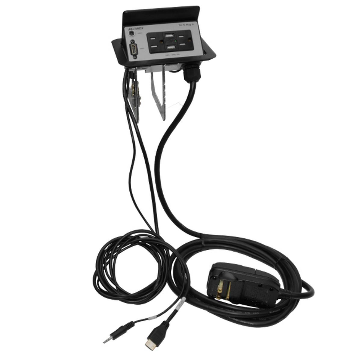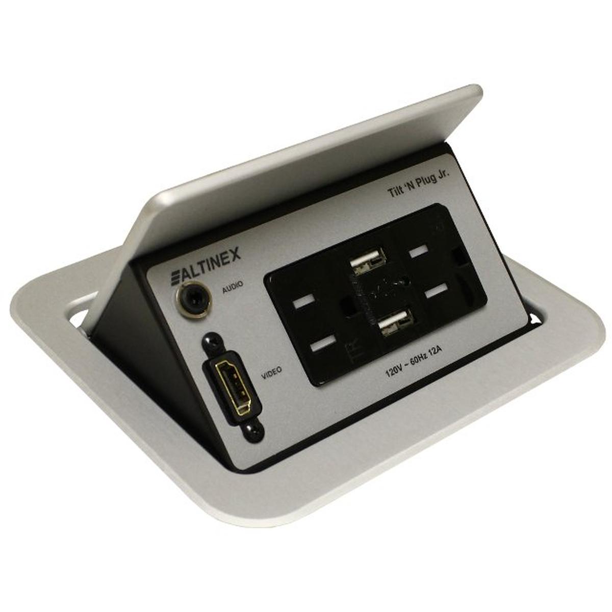 The Altinex TNP358C is a table box that pops up from your table surface, it provides video and USB and AC power charging. When open it has 2 power and 2 charging USB ports, as well as your choice of video and audio connectors. The charging is supplied by just a single 9' power cord. The USB supplies up to 3A of total power for your smart phones and tablets.