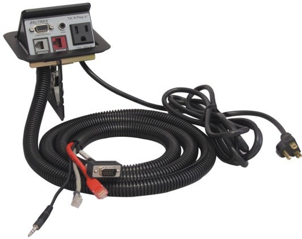 The Altinex TNP510S-AC4 is a 4 power outlet full size Tilt N Plug from Altinex. When closed Tilt N Plugs create a modern appearance in any table top, to open press the top and the gas spring tilts the unit open exposing your connections. The unit ships with the most popular connections already installed with 6' cables including, (1) 15-pin HD VGA, (1) 3.5mm stereo audio, (1) HDMI, and (1) CAT-6 connector, while the (4) AC power outlets have 9' cables. Simply drop in the hole into your table top and secure to the underside of your table with the included mounting hardware, the cables drop below to be plugged into your floor box or coupled to.
