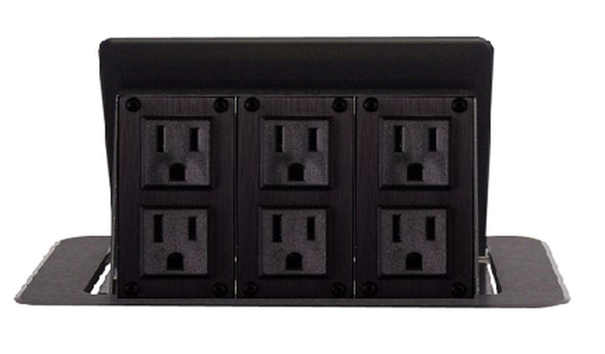 The Altinex TNP510S-AC6 is a 6 power outlet full size Tilt N Plug from Altinex. When closed Tilt N Plugs create a modern appearance in any table top, to open press the top and the gas spring tilts the unit open exposing your connections. This unit ships with three 9' Power Cords. Simply drop in the hole into your table top and secure to the underside of your table with the included mounting hardware, the cables drop below to be plugged into your floor box or coupled to.
