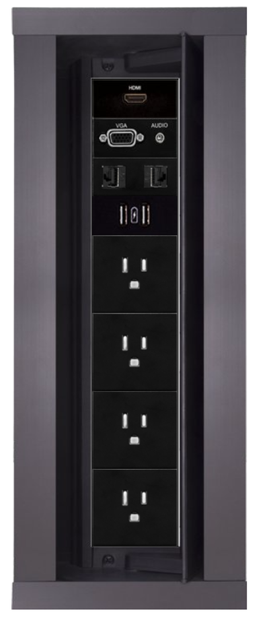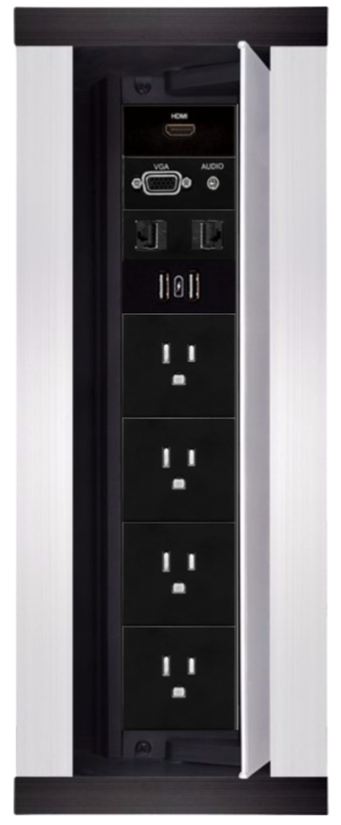 The AMX HPX-1200-KIT is a cable well box for your conference room table. The unit installs flush in a table and has a lid that tilts up and slides back down into the unit to expose your connections, the retracting lid allows everyone easy access of the connections. The kit includes 4 power, 1 HDMI, 1 VGA, 1 Audio, 2 ethernet, and 2 charging USB ports. The USB module includes a power supply to turn the USB ports into charging ports. The power includes an almost 8' cable that just needs to be plugged into an outlet.