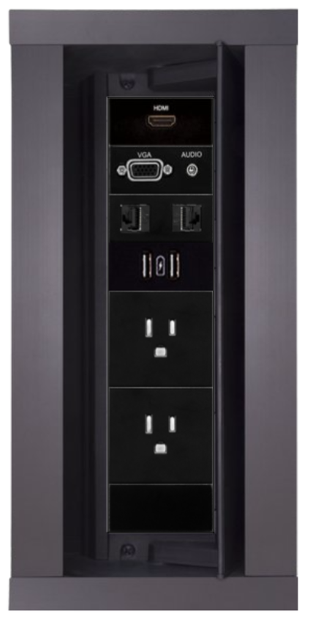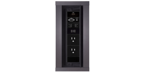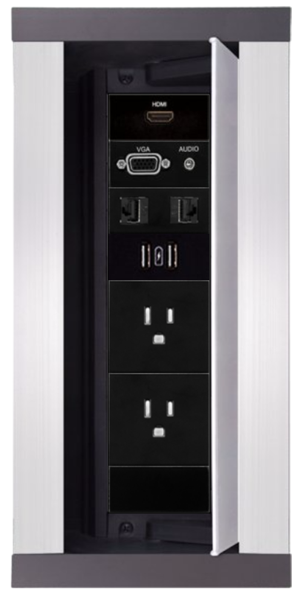 The AMX HPX-900-KIT is a cable well box for your conference room table. The unit installs flush in a table and has a lid that tilts up and slides back down into the unit to expose your connections and stay out of the way. The kit includes 2 power, 1 HDMI, 1 VGA+Audio, 2 ethernet, and 2 charging USB ports. The USB module includes a power supply to turn the USB ports into charging ports. The power includes an almost 8' cable that just needs to be plugged into an outlet.