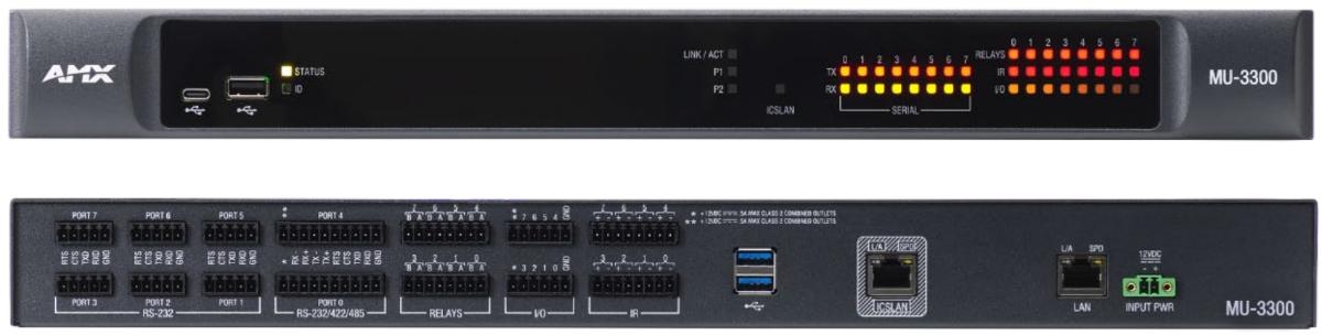 The MU-3300 is a 1 RU device and includes 8 serial ports, 8 relays, 8 IR ports, and 8 I/O ports. An ICSLan network port provides an isolated network for controlled devices.