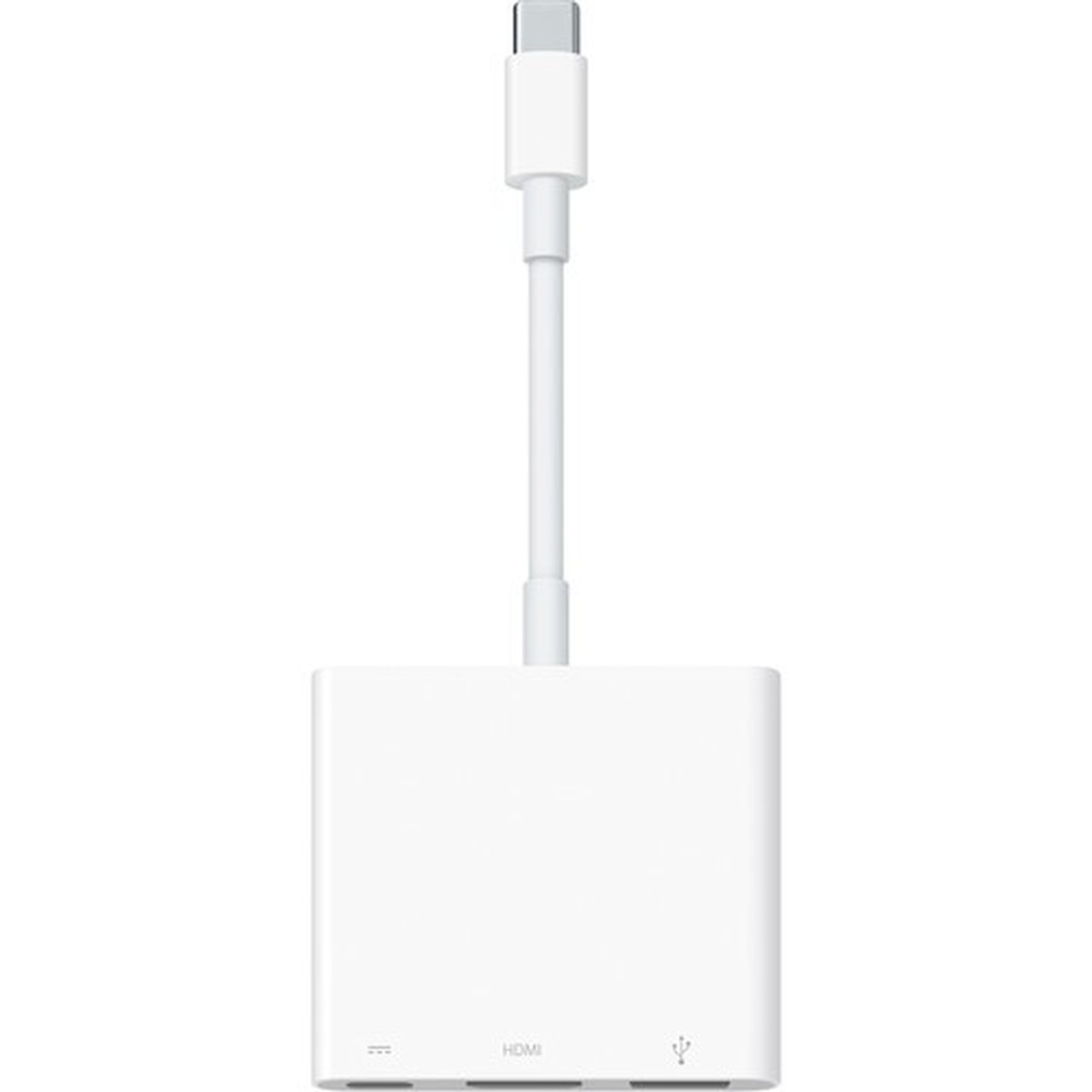 The Apple MUF82AM/A USB Type-C Digital AV Multiport Adapter lets you connect your Mac with USB Type-C or Thunderbolt 3 port to an HDMI display, while also connecting a standard USB Type-A device and a USB Type-C charging cable. It supports resolutions up to 3840 x 2160 @ 30 Hz or 1920 x 1080 @ 60 Hz.