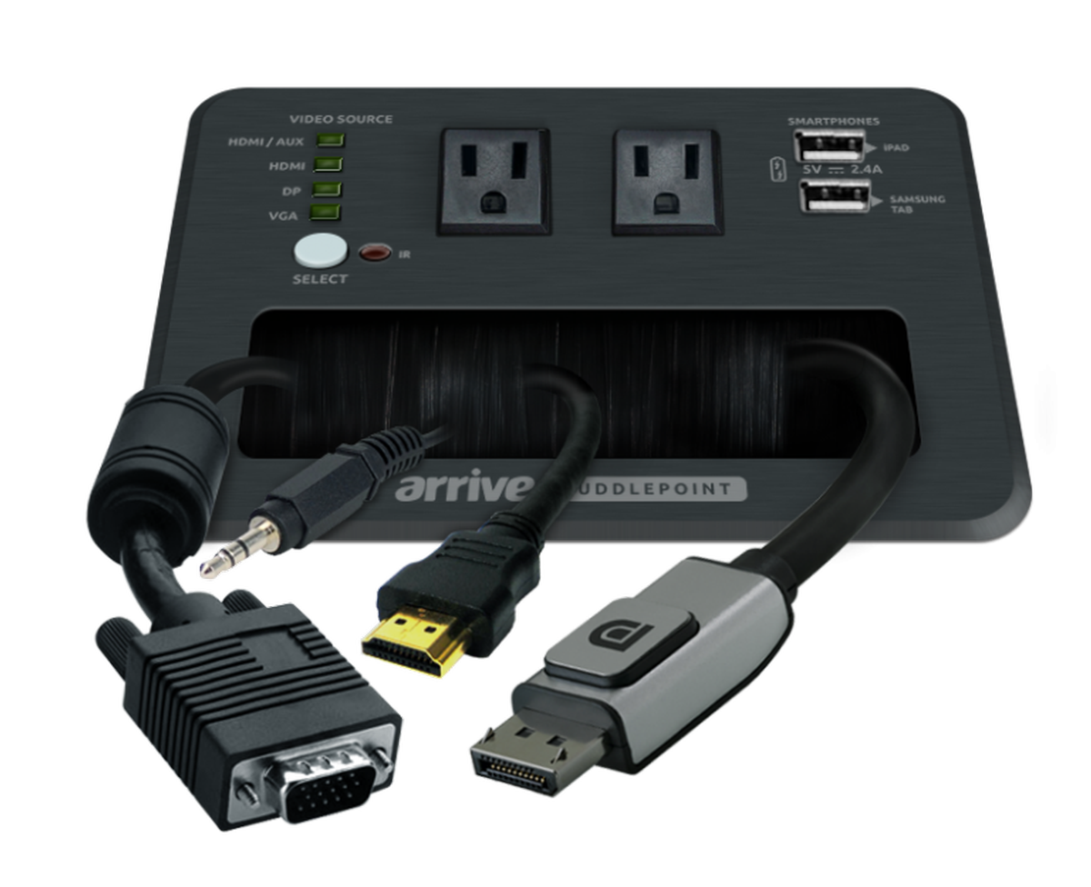 The Arrive AHP-4010-CMMH is an audio and video all-in-one table box for your huddle table, conference room table, or any table that you want an easy to use media hub. The table box features an integrated auto switcher with connections for HDMI, VGA with audio, and DisplayPort, all these connections are converted to a single HDMI out connection. The switcher detects the last plugged in connection and automatically switches, alternatively you can press the select button and switch between connected sources with an LED light showing the active connections. The switcher also scales all these connections up to 1080P and 60Hz on all source channels so you always have a perfect picture. There are 2 power outlets in the box, as well as two 2.4 amp USB fast charging ports. On the side of the unit is a three port USB 3.0 hub with a USB host connection allowing you to bring up a USB cable to your table, now you can easily connect to your microphone, camera, or touch display.