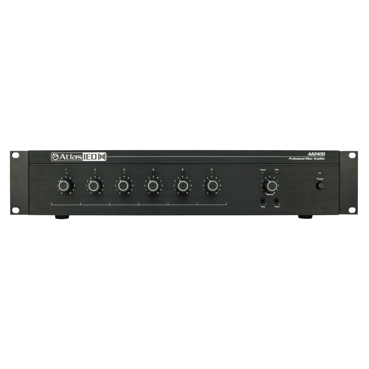 The AA240G is a 240 Watt six input multi load impedance mixer amplifier that is engineered with many unique features to assist the contractor or installer in today s commercial business audio environment. It is designed for distributed paging and background music (BGM) systems, small to medium sound masking systems, and in applications where music on hold (MOH) plus paging is required.