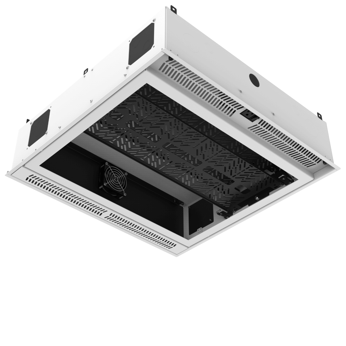 The CR222-NR ceiling-mounted equipment rack allows electronic equipment to be conveniently installed out of sight, in the ceiling plenum. The CR Series provides a space-saving solution while also being aesthetically discrete, blending in with common drop-ceiling tile designs. They permit equipment to be securely mounted above the ceiling in a sealed UL plenum-rated cabinet with an easy access door. The door assembly has an open frame design so the installer can place a ceiling tile into the frame and better conceal the entire ceiling rack. The ceiling tile cut-out is safely held in place by retainer tabs, locking it to the frame. To open the door, two retention thumb screws can be removed, and the door has attached safety cables to protect against injury.The CR222-NR provides 2RU (rack units) with a 19" standard-width. The enclosures are 2' x 2' to fit a standard reflected ceiling tile grid. The shelf system has universal mounting holes to easily bolt or tie down electronic devices. As an option, a rack rail kit can be purchased for installing rack mount installable electronic equipment. The optional CR222RR rack rail provides two rack units (2RU)AmbiTILT - Easily load and service equipmentAn AtlasIED advantage is the AmbiTILT mechanism with three methods to easily load and service equipment. For the first method, the shelf system has quick-release cane bolts. The two-(2) front cane bolts can be released and the entire shelf will tilt down towards the front. The shelf assembly is held in place by two safety cables and the two rear cane bolts. Being an ambidextrous design, the two-(2) rear cane bolts can be released in the same fashion and the rear section of the shelf will tilt downward for quick access to equipment's rear connectors. The third option allows an integrator to completely remove the entire shelf system by releasing the front and rear cane bolts followed by releasing the two safety cables via the quick-release locking pins.Integrated AC Power PackThe CR222-NR incorporates an integrated UL-listed power pack for powering the mounted electronic devices and data projector. There are five-(5) electrical outlets provided with standard 15 Amp Edison-style plugs. Four-(4) electrical outlets are located inside the cabinet and one-(1) outlet faces down and remains exposed when the door is shut. This allows a projector to be easily powered. The CR222-NR does not include PowerAWAKE technology. All the outlets are turned on or off by the exposed on/off switch.The power supplies incorporate a whisper quiet fan assembly (24dBSPL A-weighted) for equipment cooling.Multiple Punch-Outs for Electrical and A/V ConnectorsThe CR222-NR is built "Texas Tough" in AtlasIED's Texas-based manufacturing facility. Proudly made in America and built to last, 18AWG powder coated metal provides a strong and rigid assembly with decades of operational use. Another AtlasIED advantage, the cabinet side panels include four-(4) removable 4" square standard cover plates. There are two per side and each side has one cover plate with a single 11/2" knockout and the other plate with two double knockouts for 1/2" or 3/4" conduit connection. The provided cover plates can be replaced with an installer-provided custom plate with connectors such as an Ethernet jack, HDMI jack, NL4, XLR, RCA connectors and much more.Multiple Installation Mounting OptionsAtlasIED provides three mounting methods.The first method is by suspension from threaded rod via AtlasIED's optional threaded rod rail kit. The kit includes two mounting bars and hardware for attachment to the enclosure. The bars provide holes to attach threaded rods with bolts supplied by a qualified installer. This is the preferred method as it keeps the whole assembly the most stable. Note: The threaded rod, bolts, and clamps are not included in the kit, they are sold separately. CR222TRK - For use in the CR222 Series cabinetsThe second method is by suspension cables via AtlasIED's optional cable mounting kit. The kit includes four-(4) aircraft cables, thimbles, and crimp sleeves. The kit also includes four-(4) quick adjustment cable locks allowing quick cable length adjustments and cabinet leveling. CR2CK - Works for all models.The last method is using third party mounting accessories. The cabinet comes with extruded mounting ears for attachment points.