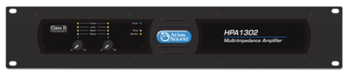 Atlas Sound's HPA1302 is a dual-channel commercial high-power amplifier. This amplifier is ideal for use in commercial distributed systems (70V/100V) as well as professional environments that require 8Ω and 4Ω loads. The HPA1302 is a terrific fit in nightclub environments, houses of worship, convention center, hotels, and retail stores.