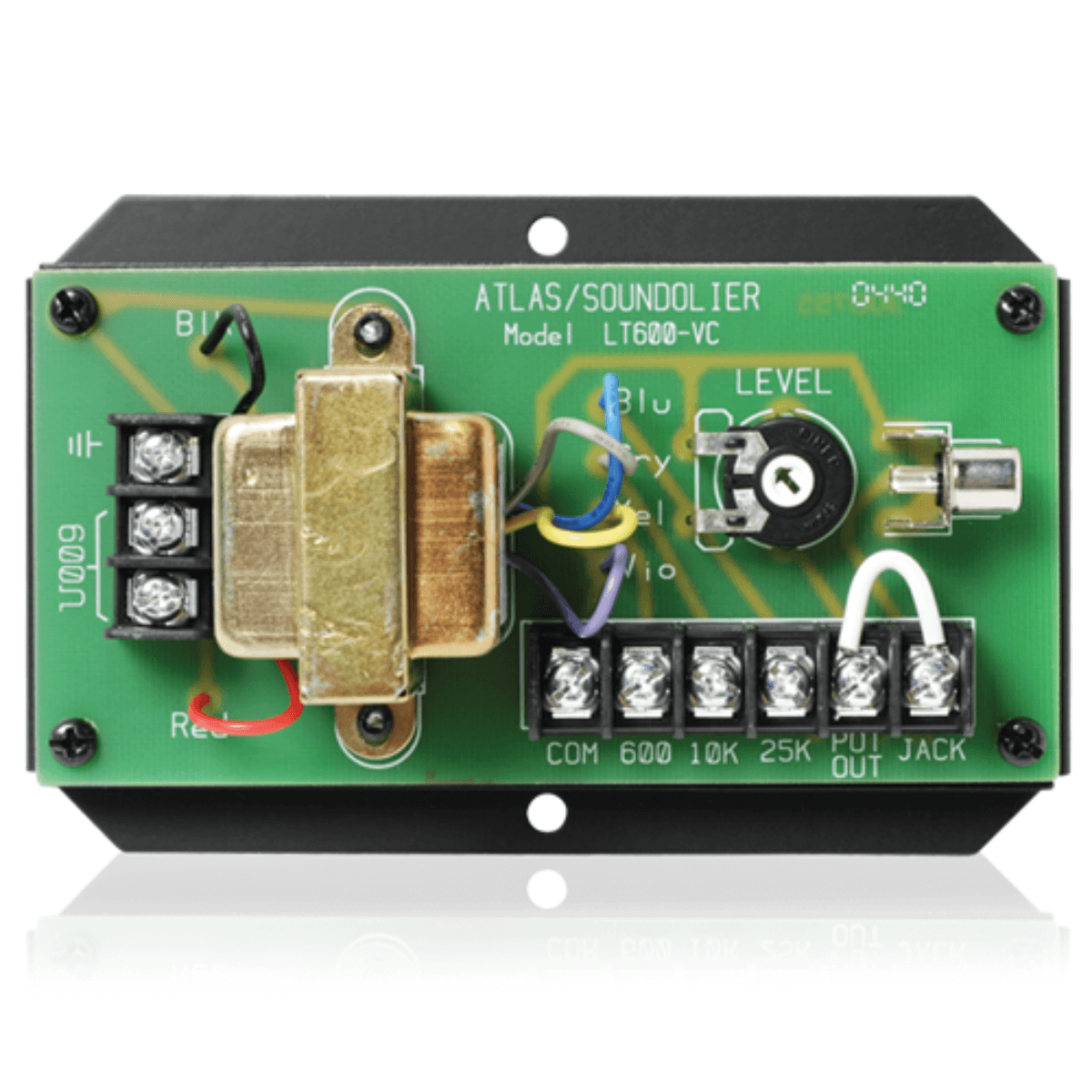 The LT600-VC is a versatile unit for matching telephone-type, 600 ohm line circuits with HI-Z circuits. It can also be used as a 600 ohm to 600 ohm isolation transformer. Recommended for coupling of tele-phone- type lines into amplified sound systems, background music and paging systems, recording equipment, or studio electronics. Built-in potentiometer provides optional adjustability for the 25K output level. The 600 ohm input may be matched to 600, 10K and 25K-ohm circuits. All components are mounted on a printed circuit board. Steel chassis includes mounting ears and "insta-mount" tape. Transformer is shielded to minimize induced hum. Unit includes a phono jack on the output side for convenient connection to amplifier or other equipment circuitry. Jack can be connected to various transformer taps via barrier strip jumper. (Factory-installed jumper connects jack to potentiometer output).