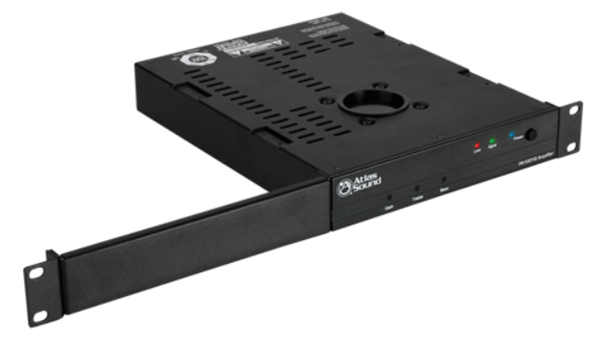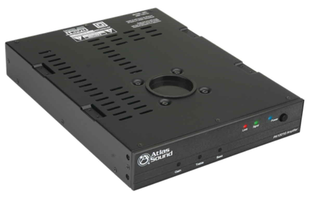 Atlas Sound's PA1001G single-channel pole-mount amplifier is a compact but powerful device. It features a through-chassis mount that is designed specifically to accompany pole-mounted projector systems. These devices can also be rack mounted; it is 1RU in height and 1/2 R in width.