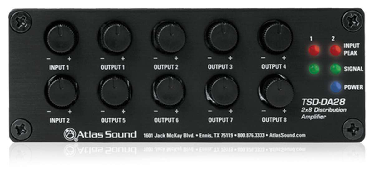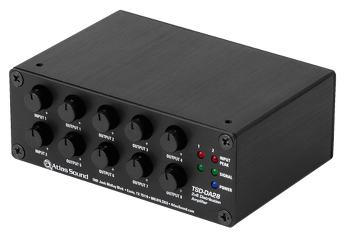 Atlas Sound introduces the TSD-DA28 is a 2x8 distribution amplifier. It distributes clean, strong signal locally or to remote locations. This high-quality distribution amp distributes two independent, balanced line level inputs to up to 8 isolated variable outputs. This distribution factor makes the TSD-DA28 ideal in houses of worship, sports bars, and industrial environments.